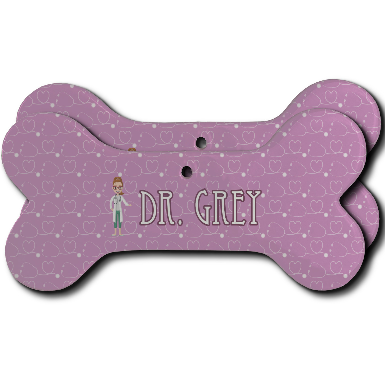 The design features an avatar doctor that is wearing a labcoat. You can easily change her hair color and skin tone. You can even swap her out for a male doctor! The background has a subtle pattern made out of stethescopes and is a fun purple. You personalization goes on top and below the avatar.