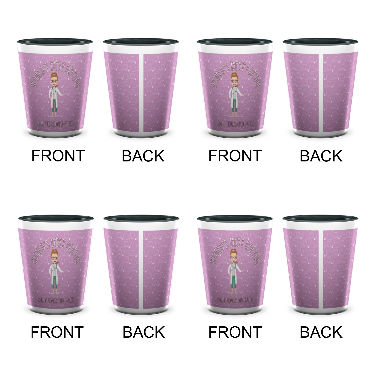 The design features an avatar doctor that is wearing a labcoat. You can easily change her hair color and skin tone. You can even swap her out for a male doctor! The background has a subtle pattern made out of stethescopes and is a fun purple. You personalization goes on top and below the avatar.