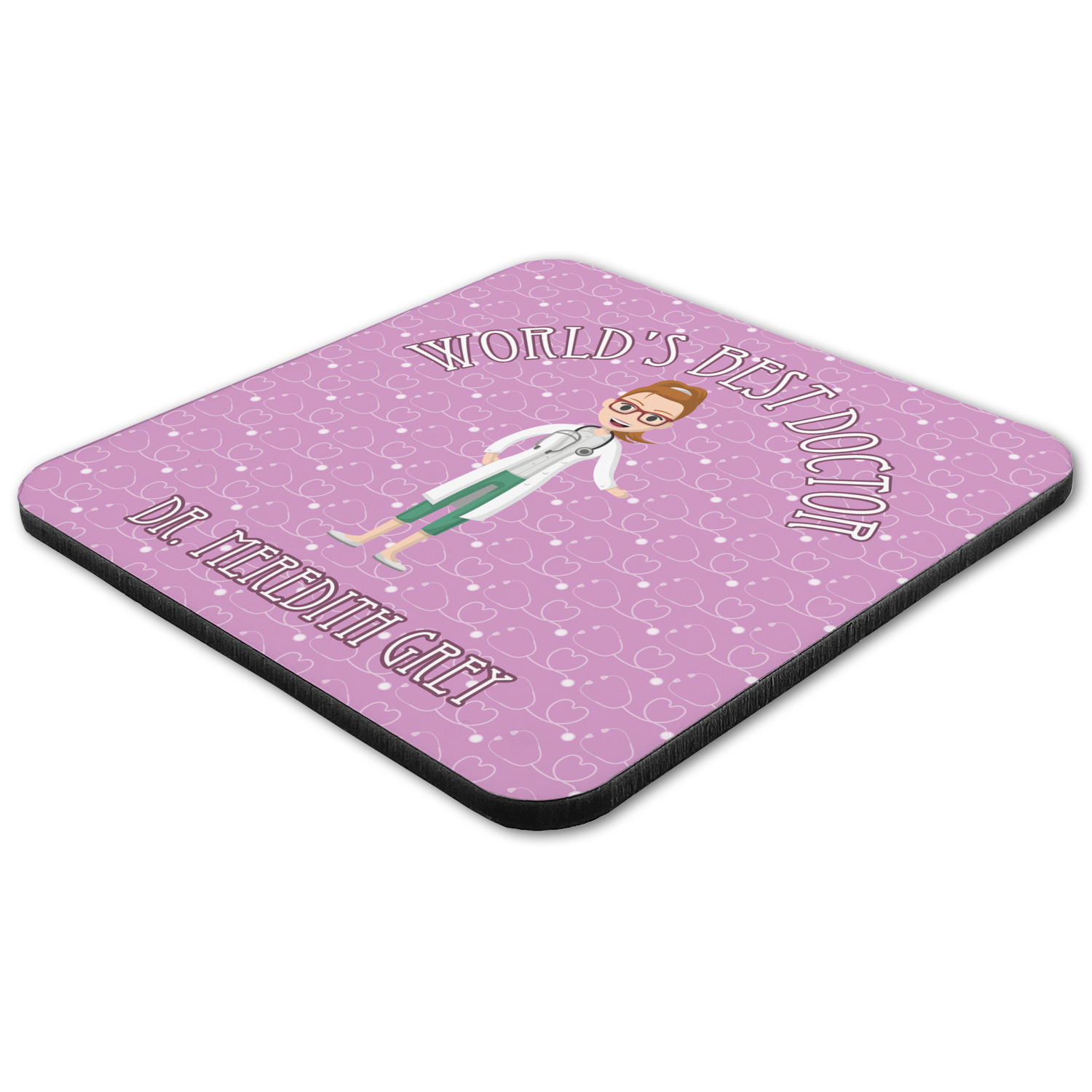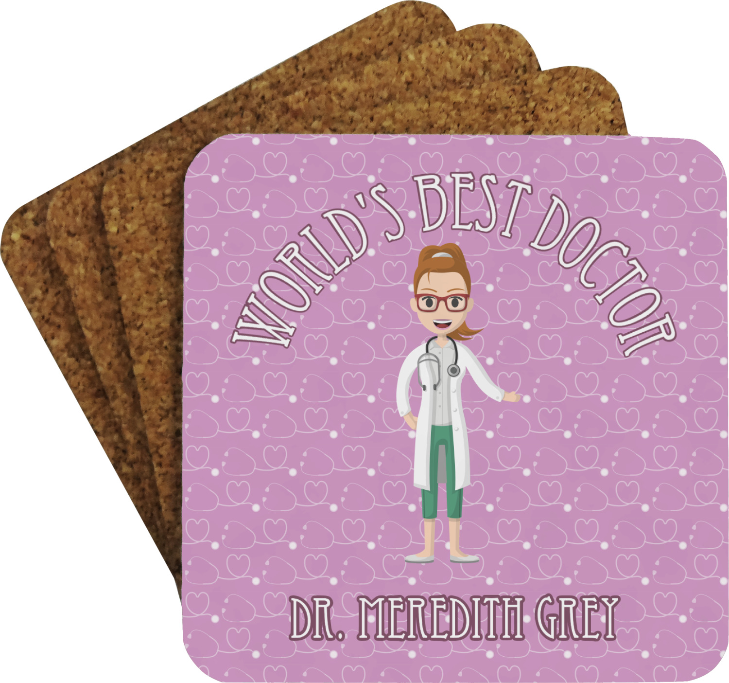 The design features an avatar doctor that is wearing a labcoat. You can easily change her hair color and skin tone. You can even swap her out for a male doctor! The background has a subtle pattern made out of stethescopes and is a fun purple. You personalization goes on top and below the avatar.