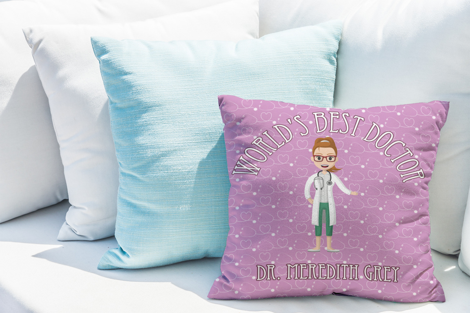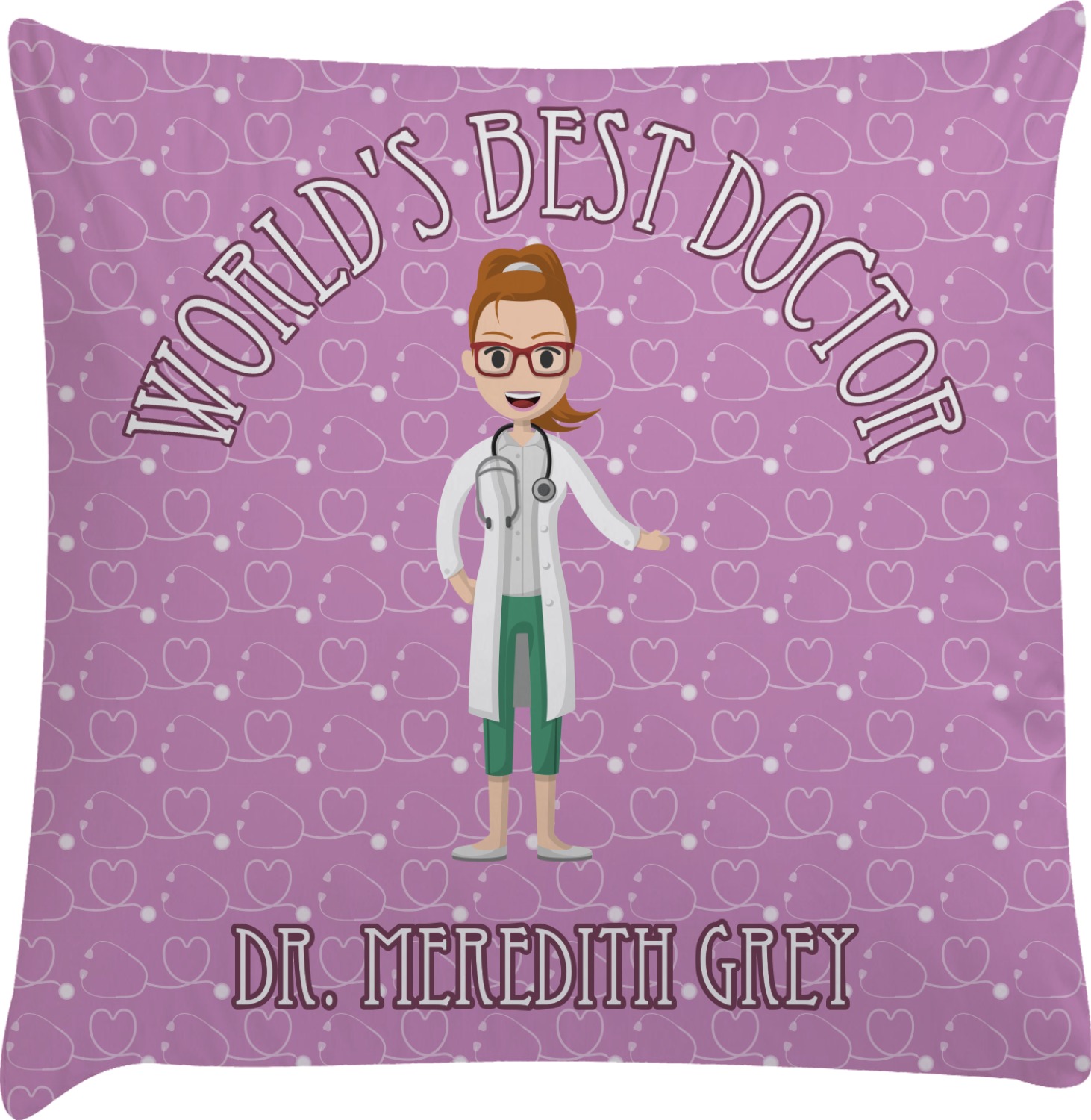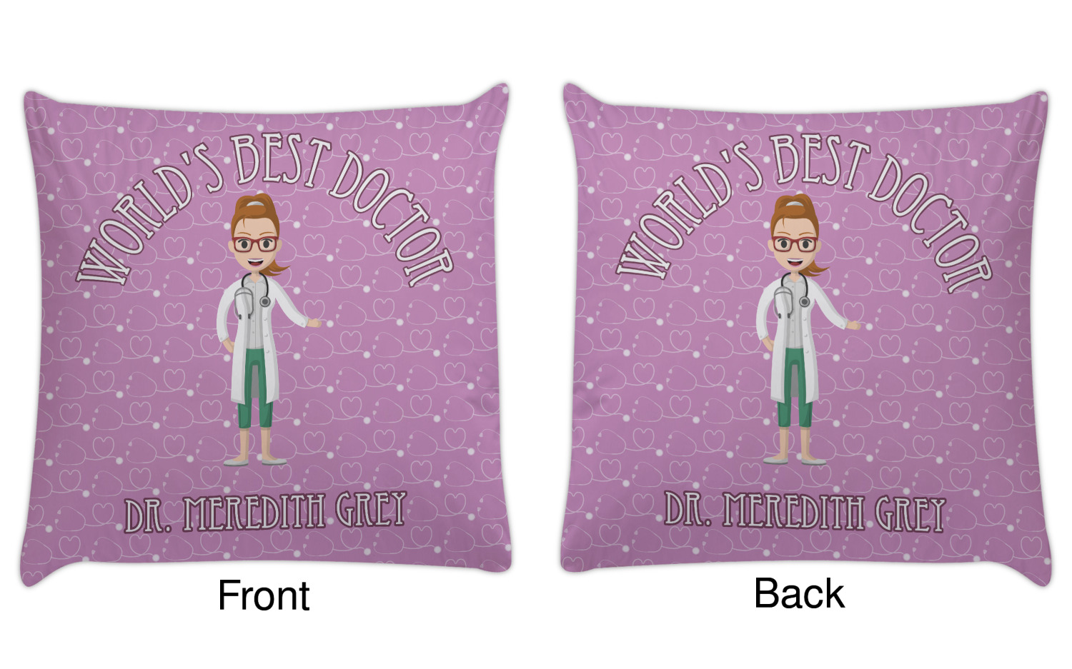 The design features an avatar doctor that is wearing a labcoat. You can easily change her hair color and skin tone. You can even swap her out for a male doctor! The background has a subtle pattern made out of stethescopes and is a fun purple. You personalization goes on top and below the avatar.
