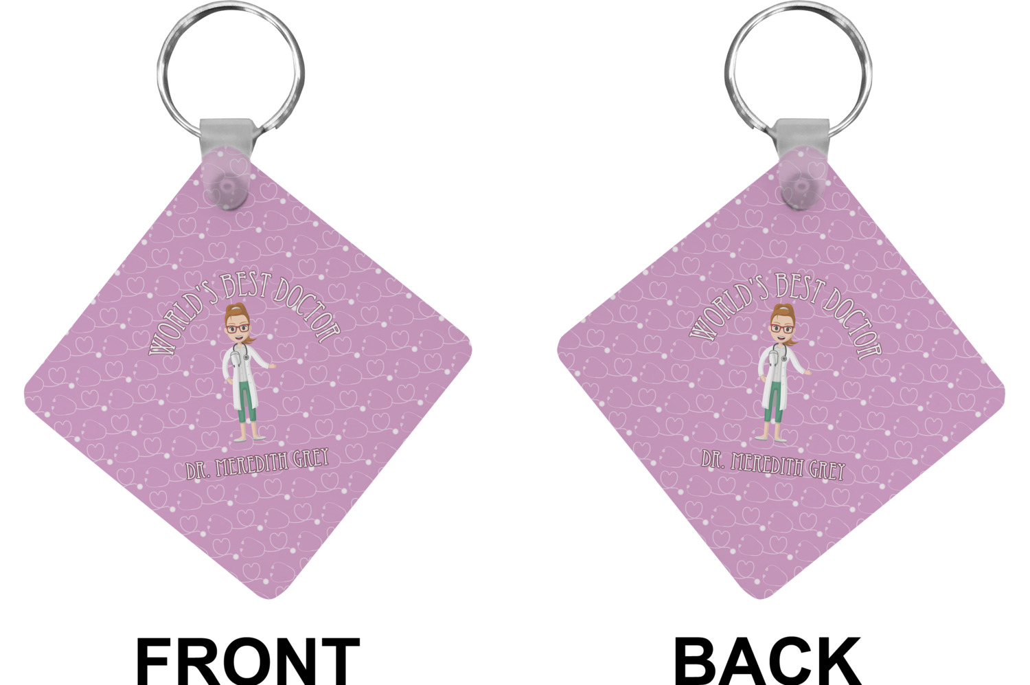 The design features an avatar doctor that is wearing a labcoat. You can easily change her hair color and skin tone. You can even swap her out for a male doctor! The background has a subtle pattern made out of stethescopes and is a fun purple. You personalization goes on top and below the avatar.