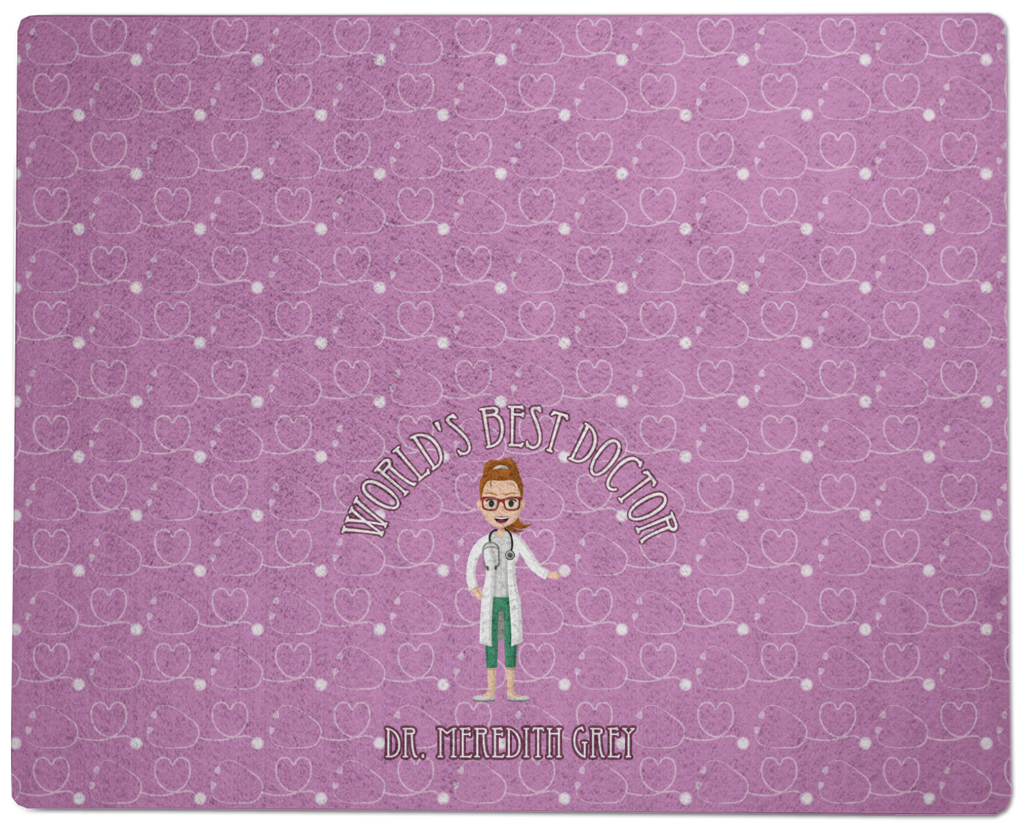 The design features an avatar doctor that is wearing a labcoat. You can easily change her hair color and skin tone. You can even swap her out for a male doctor! The background has a subtle pattern made out of stethescopes and is a fun purple. You personalization goes on top and below the avatar.