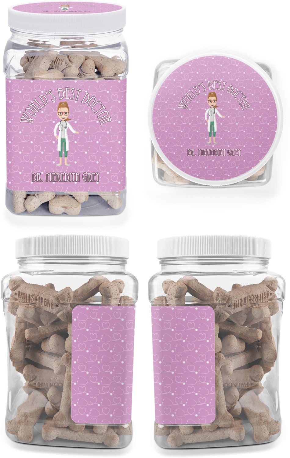 This half gallon jar, made from a sturdy plastic, is the perfect way to keep treats from any naughty pet paws, while still keeping them ready on hand for when your pup performs an impressive trick. This dog cookie jar features a screw-on, white lid that displays your personalized design on a vinyl sticker. We apply another customized sticker that wraps around the front and sides of the jar. Our dog treat jar also has indentations on the rear ends of the sides, which allows for convenient handling, and its square frame allows for easy storage.