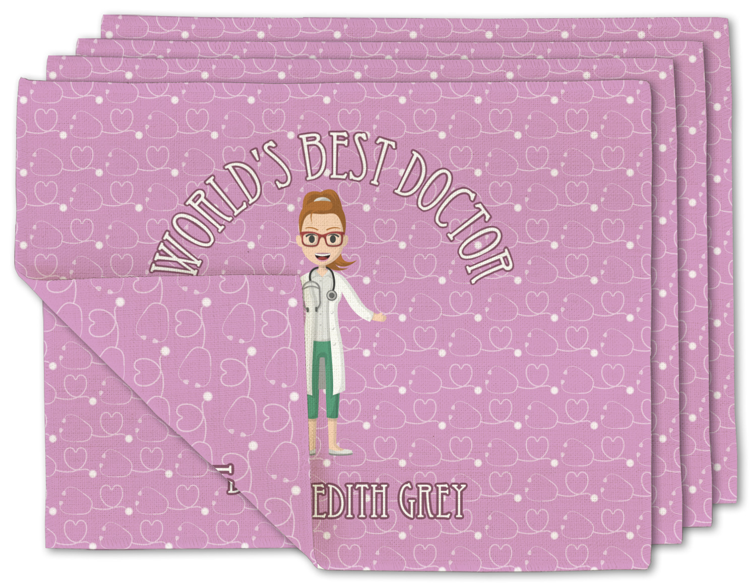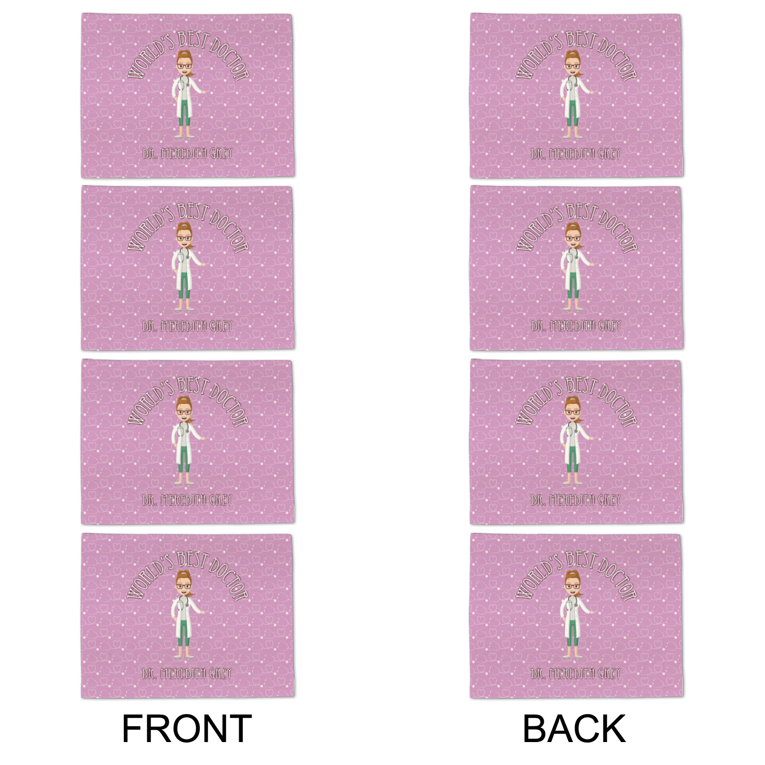 The design features an avatar doctor that is wearing a labcoat. You can easily change her hair color and skin tone. You can even swap her out for a male doctor! The background has a subtle pattern made out of stethescopes and is a fun purple. You personalization goes on top and below the avatar.