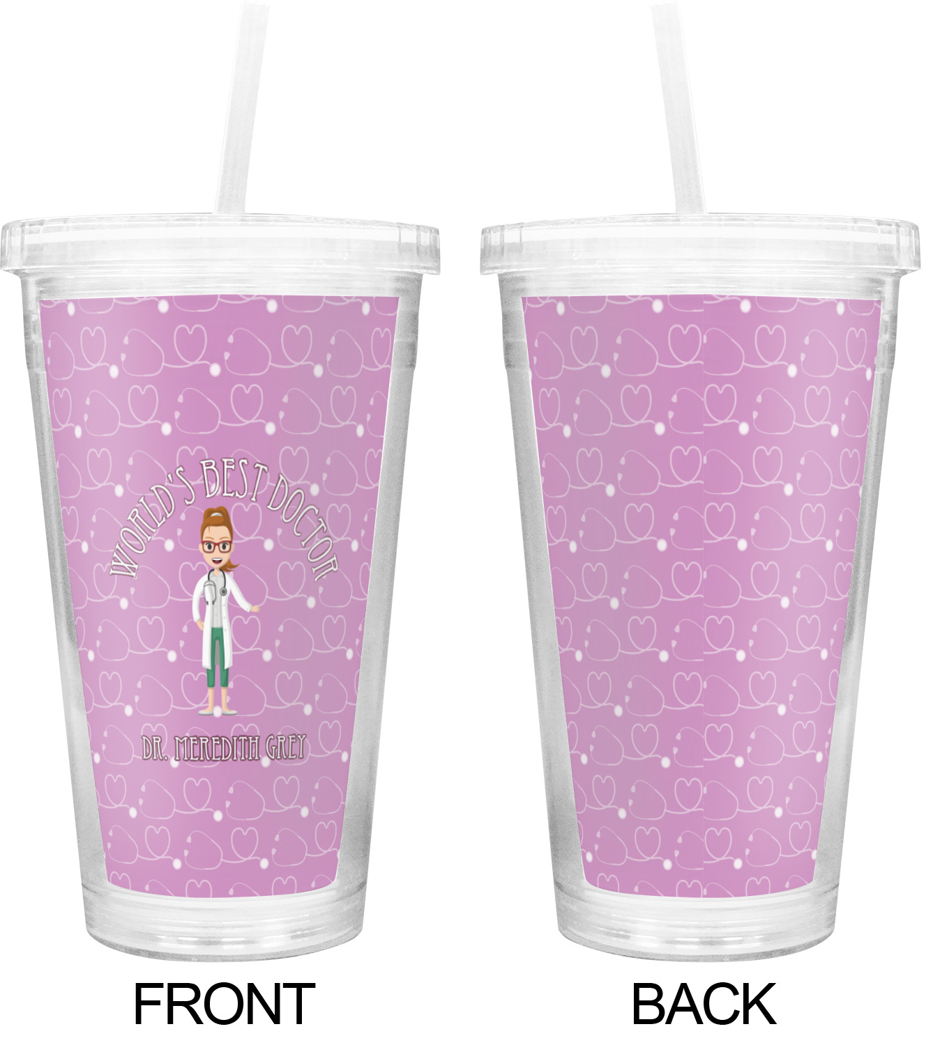 The design features an avatar doctor that is wearing a labcoat. You can easily change her hair color and skin tone. You can even swap her out for a male doctor! The background has a subtle pattern made out of stethescopes and is a fun purple. You personalization goes on top and below the avatar.