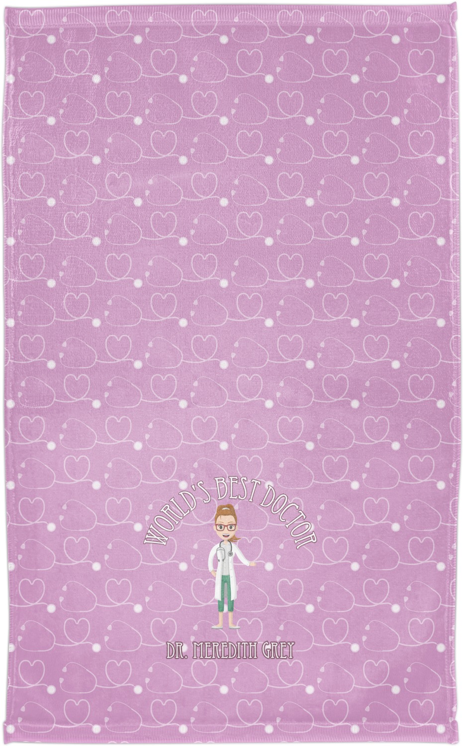 The design features an avatar doctor that is wearing a labcoat. You can easily change her hair color and skin tone. You can even swap her out for a male doctor! The background has a subtle pattern made out of stethescopes and is a fun purple. You personalization goes on top and below the avatar.