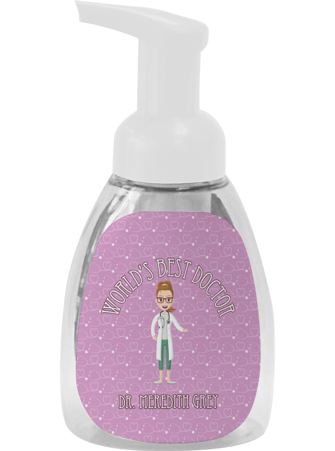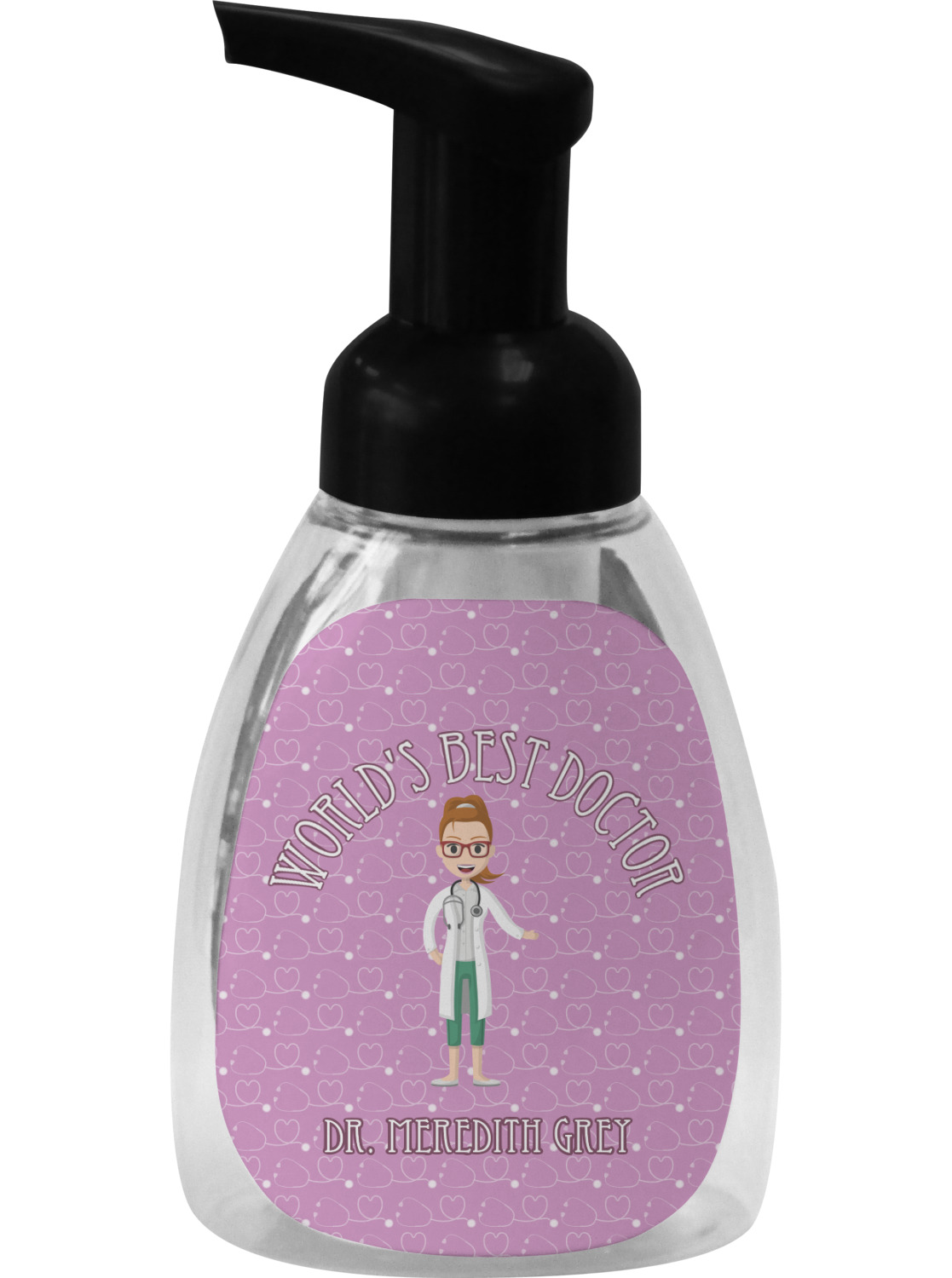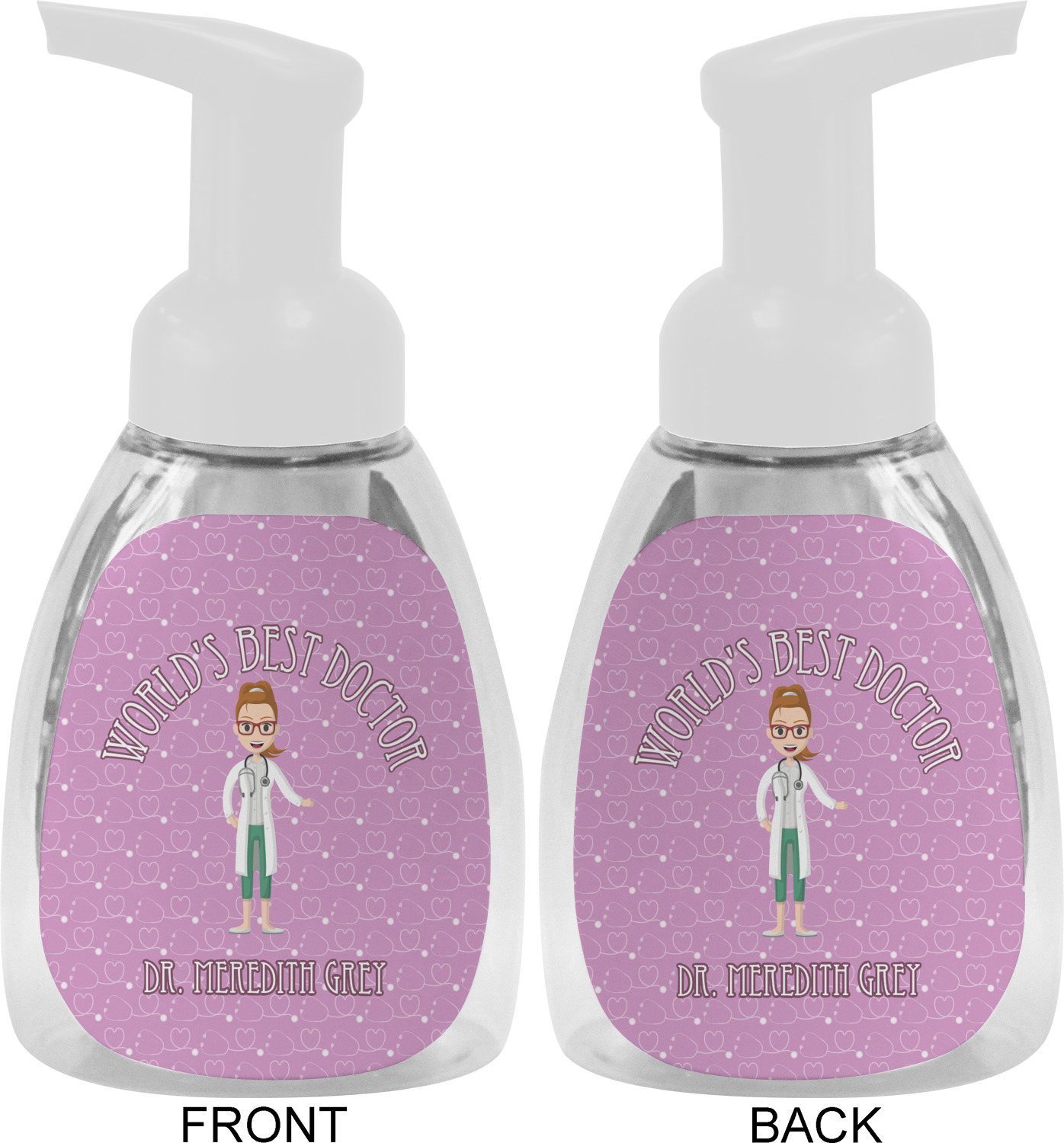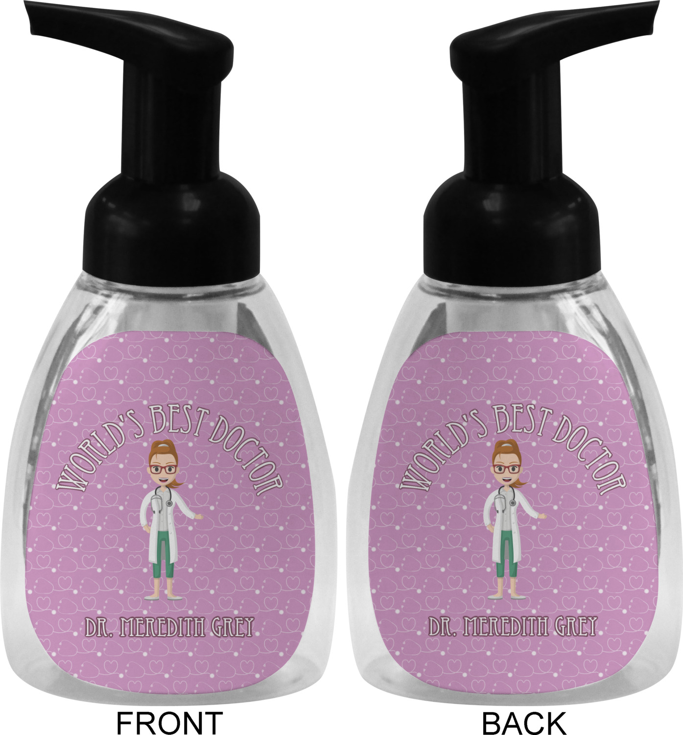 The design features an avatar doctor that is wearing a labcoat. You can easily change her hair color and skin tone. You can even swap her out for a male doctor! The background has a subtle pattern made out of stethescopes and is a fun purple. You personalization goes on top and below the avatar.