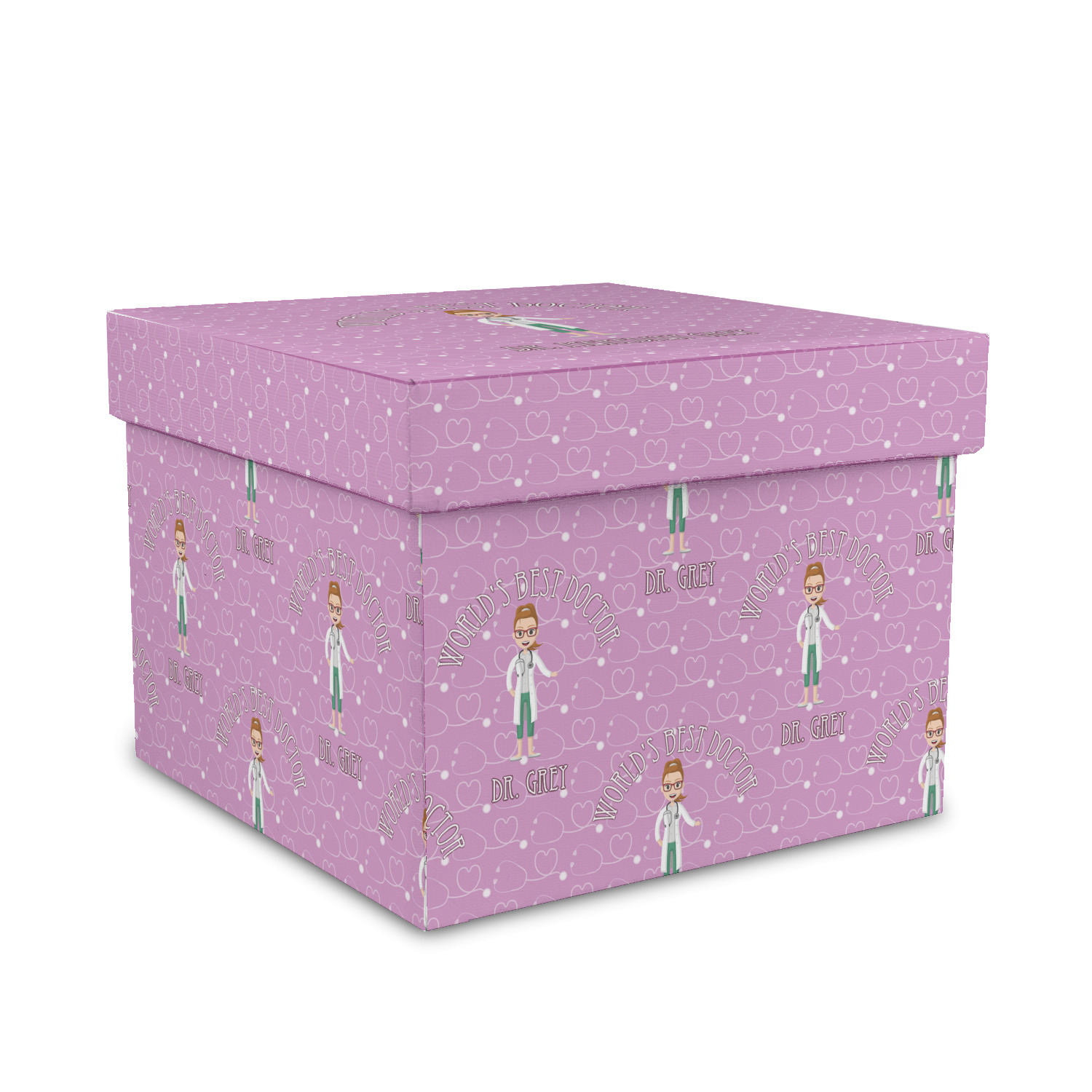 The design features an avatar doctor that is wearing a labcoat. You can easily change her hair color and skin tone. You can even swap her out for a male doctor! The background has a subtle pattern made out of stethescopes and is a fun purple. You personalization goes on top and below the avatar.
