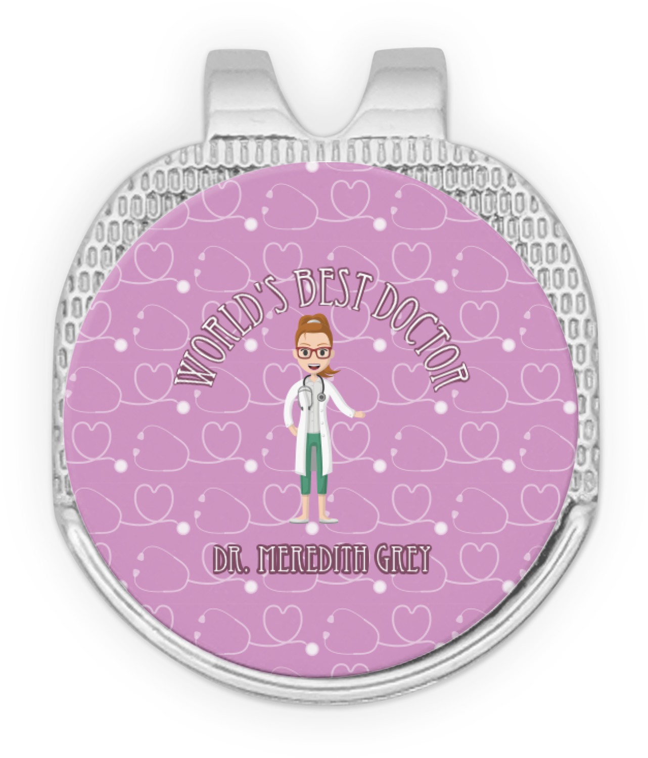 The design features an avatar doctor that is wearing a labcoat. You can easily change her hair color and skin tone. You can even swap her out for a male doctor! The background has a subtle pattern made out of stethescopes and is a fun purple. You personalization goes on top and below the avatar.