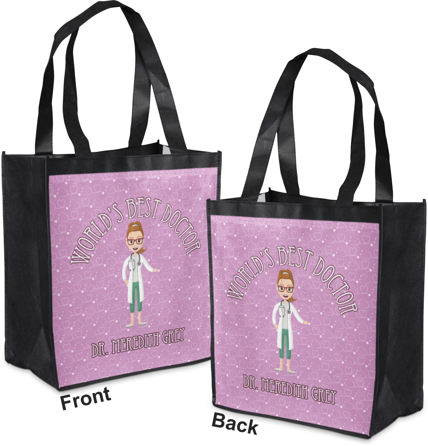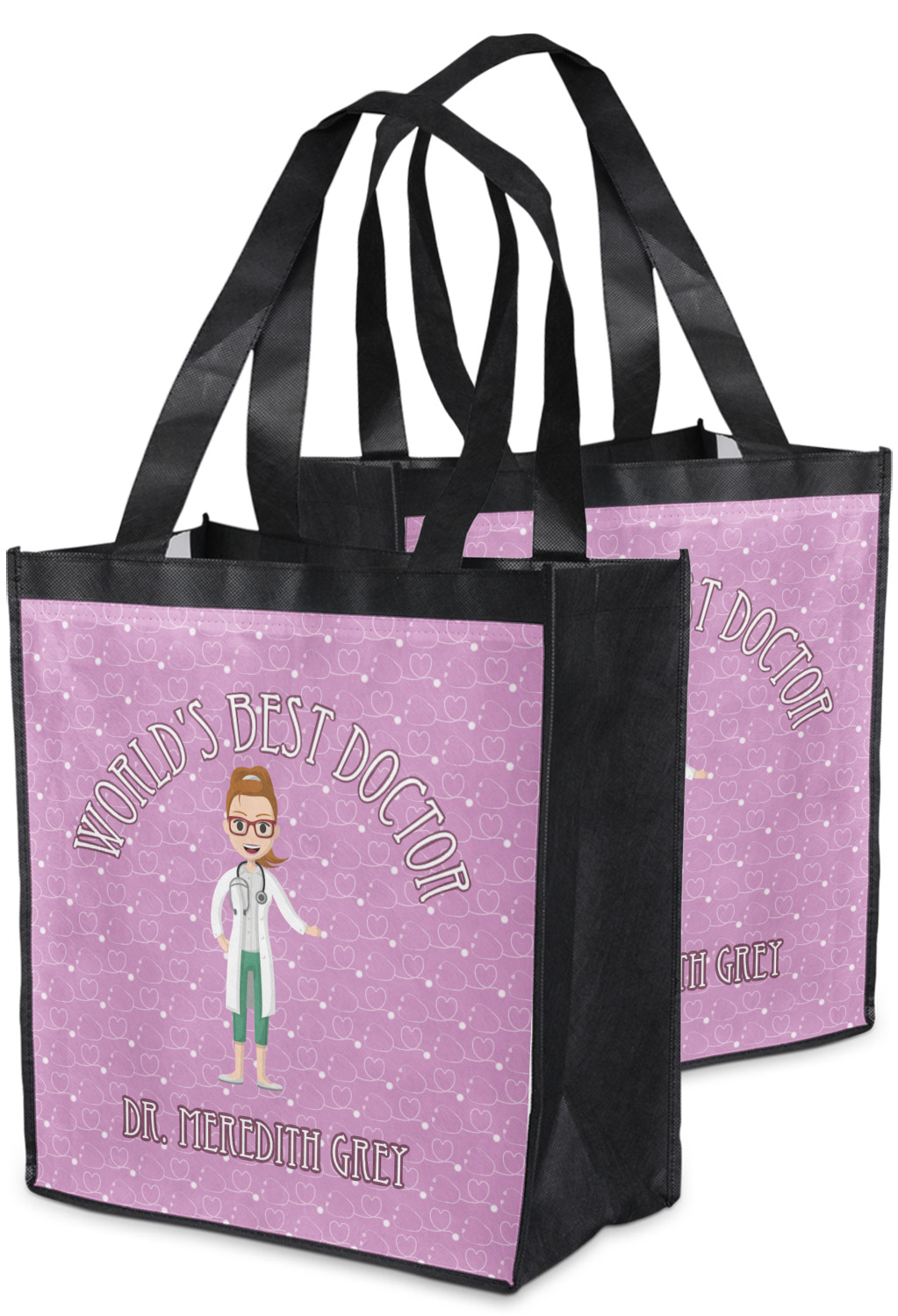 The design features an avatar doctor that is wearing a labcoat. You can easily change her hair color and skin tone. You can even swap her out for a male doctor! The background has a subtle pattern made out of stethescopes and is a fun purple. You personalization goes on top and below the avatar.