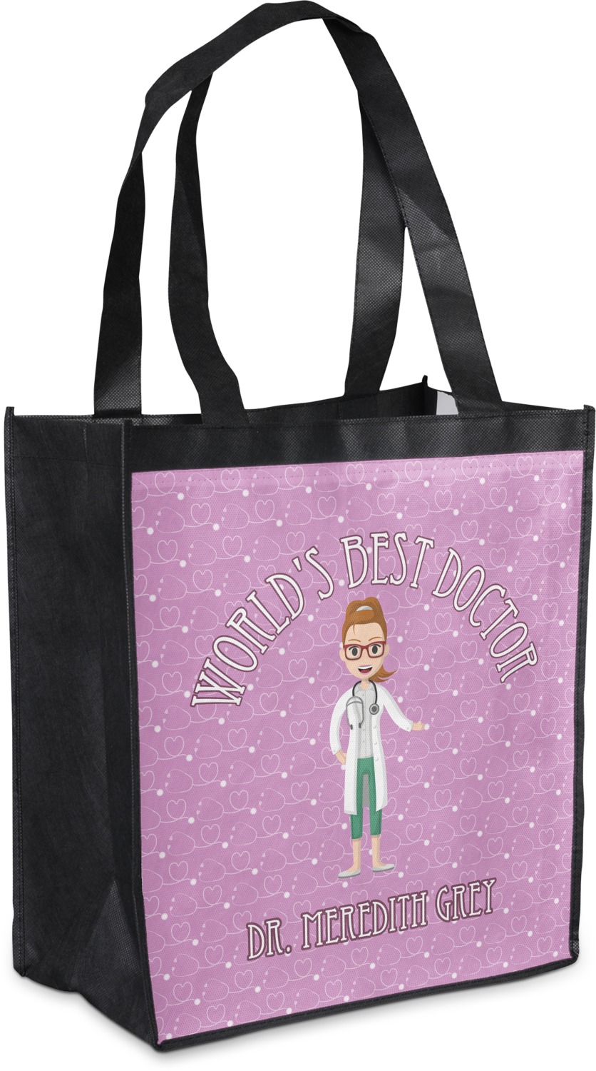 Made from a durable, biodegradable material, these reusable shopping bags can support up to 30 pounds of weight. With two large handles, measuring at 8.5 inches each, these personalized tote bags are easy to carry to your vehicle or home. The bag itself is 12 by 13.5 inches, and can expand to a depth of 7 inches. Your customization is printed on both the front and back, while the remaining sides, trim, and handle are a sleek, charcoal black.