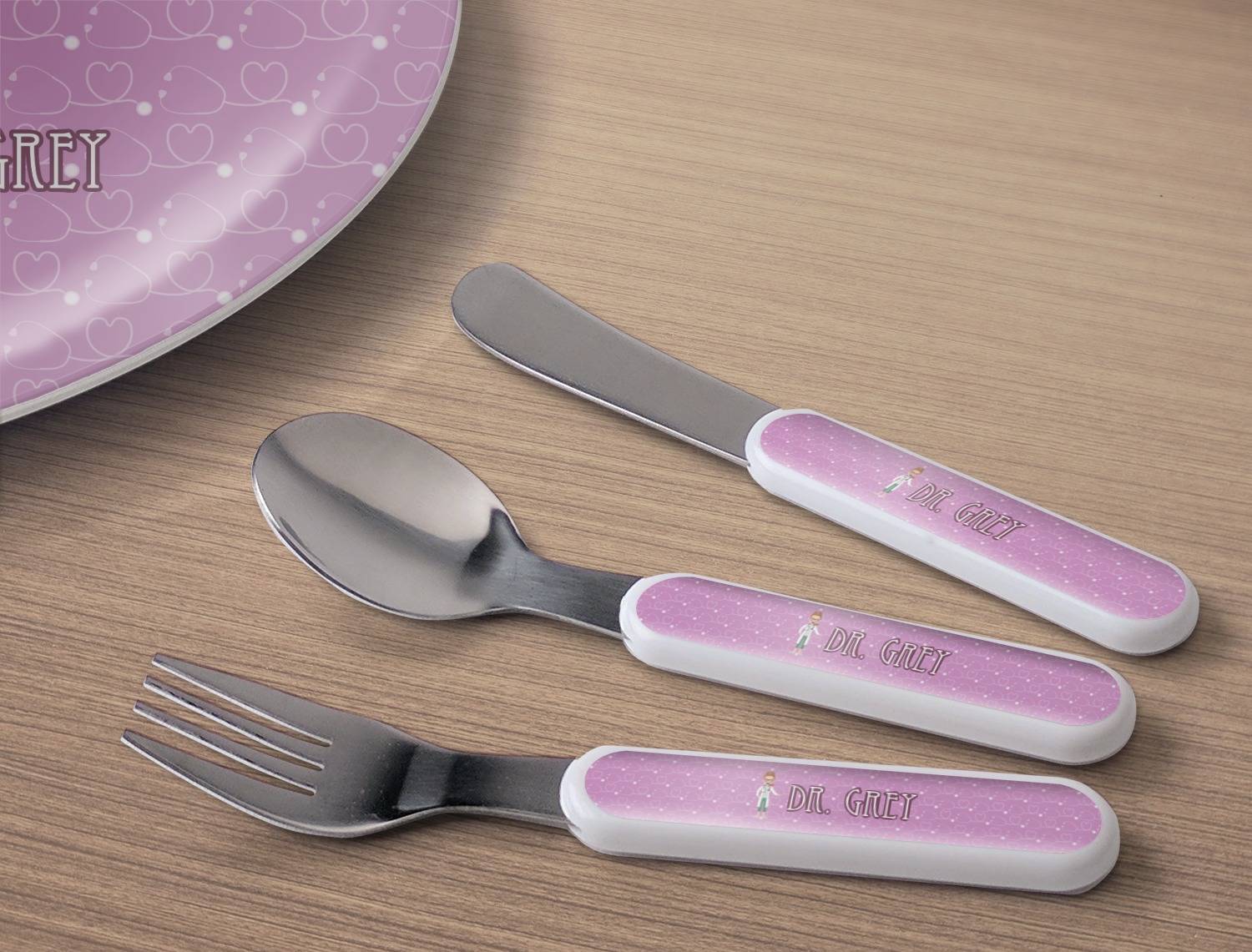 This set of kids' silverware includes a 5.5 inch spoon, fork, and knife, catered to your little one's needs. The prongs of this fork are flat and dull, while our spoon is small enough for tiny mouths, and the dullness of the knife itself resembles a butter knife, at most. These kids' utensils are made of stainless steel, while the handles are crafted from a durable plastic that will withstand the energy and use of your young one. We print your customization across the handles, making the cutlery set unique to your child only.