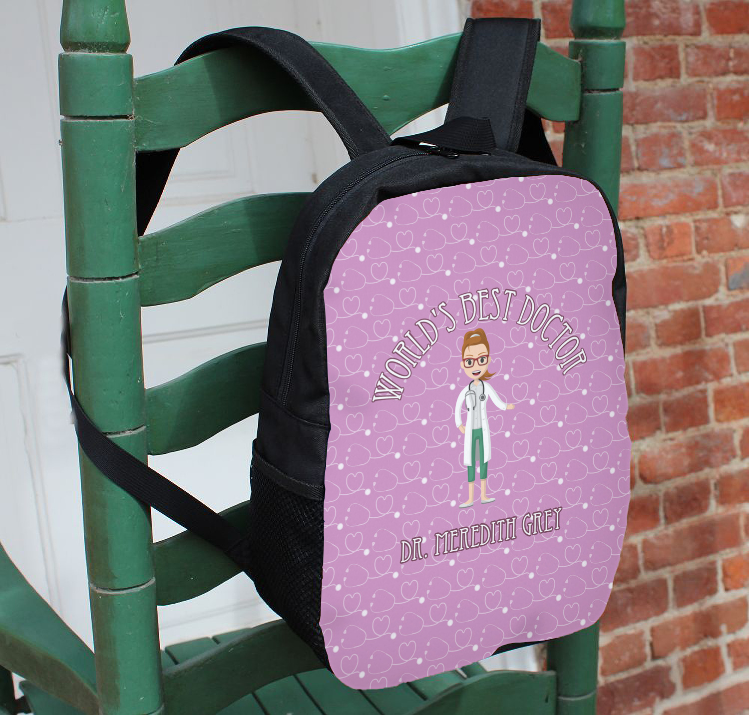 The design features an avatar doctor that is wearing a labcoat. You can easily change her hair color and skin tone. You can even swap her out for a male doctor! The background has a subtle pattern made out of stethescopes and is a fun purple. You personalization goes on top and below the avatar.