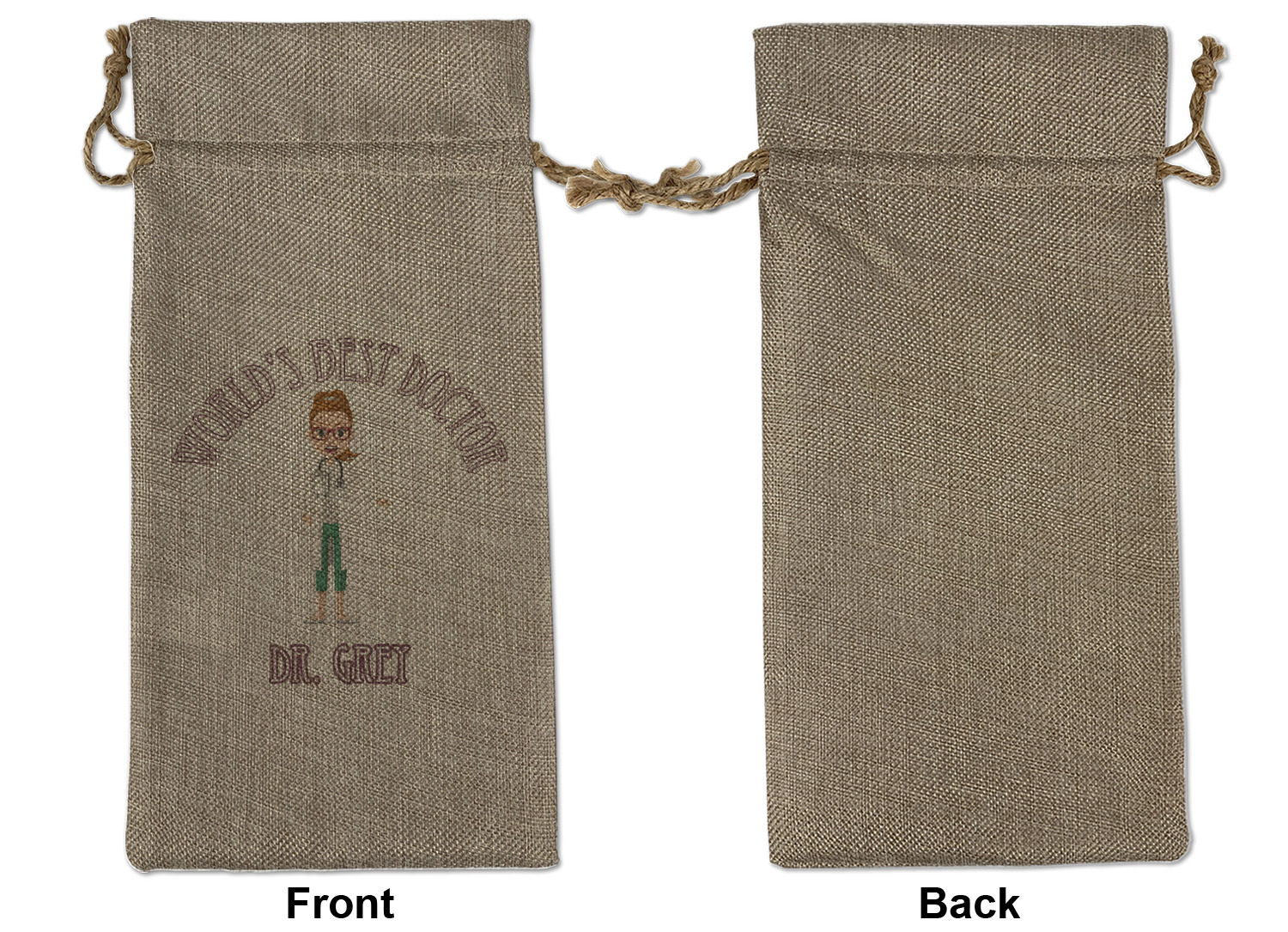 We sell our Burlap Gift Bags in 3 variant sized bags. Made with burlap polyester, each personalized bag can be secured with a twine drawstring pull. Your custom design is available to print on one side or both sides - completely up to you! The sizes of the bags measure approximately 4.5" x 6.5" for the smallest size, 6.5" x 8.0" for the medium size, and 6.5" x 13.5" for the large-sized bag.