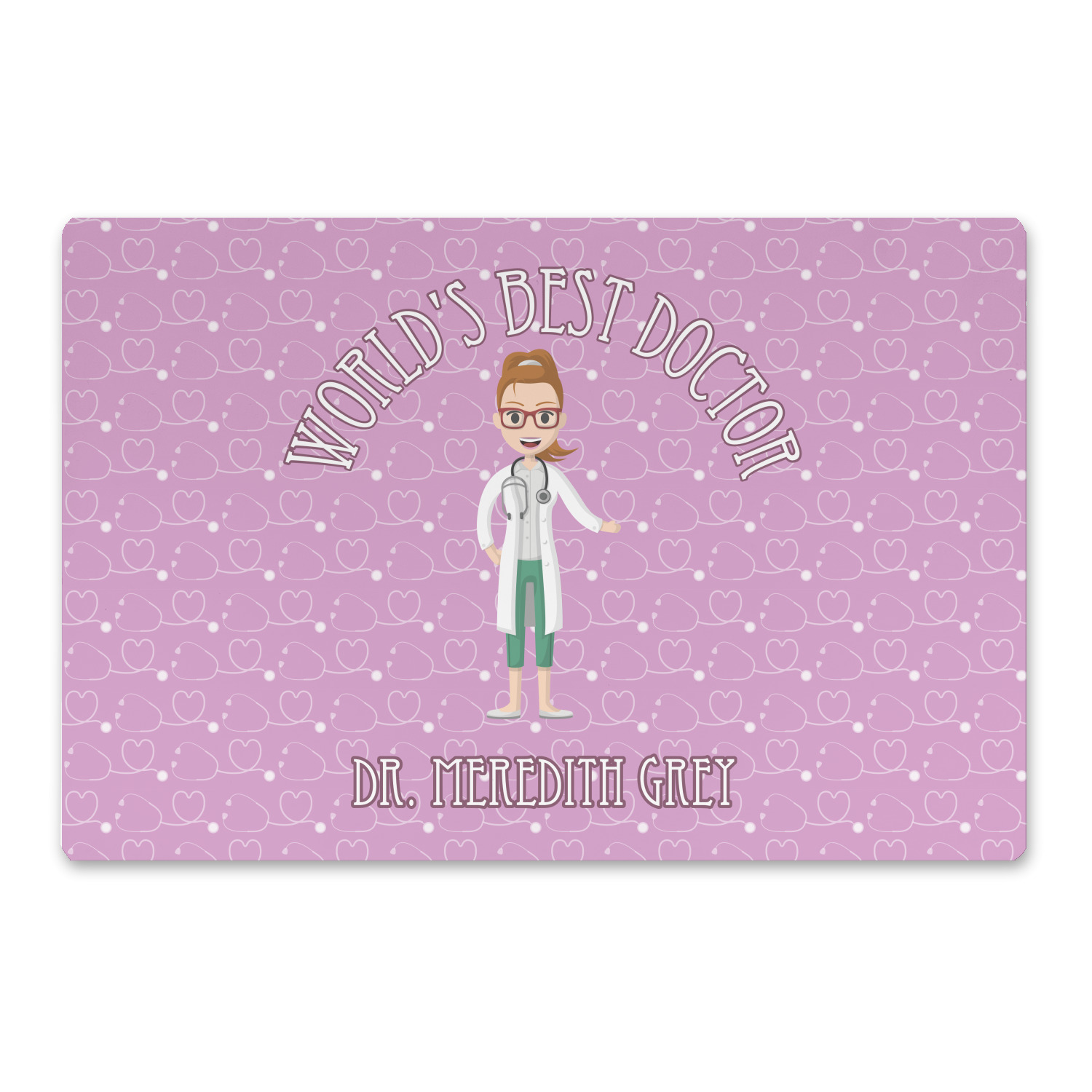 The design features an avatar doctor that is wearing a labcoat. You can easily change her hair color and skin tone. You can even swap her out for a male doctor! The background has a subtle pattern made out of stethescopes and is a fun purple. You personalization goes on top and below the avatar.
