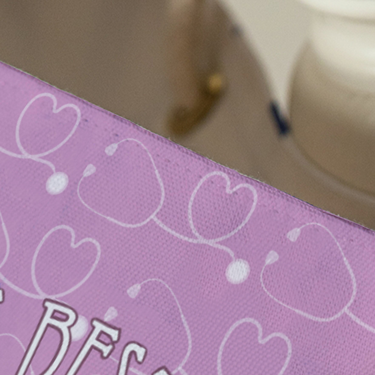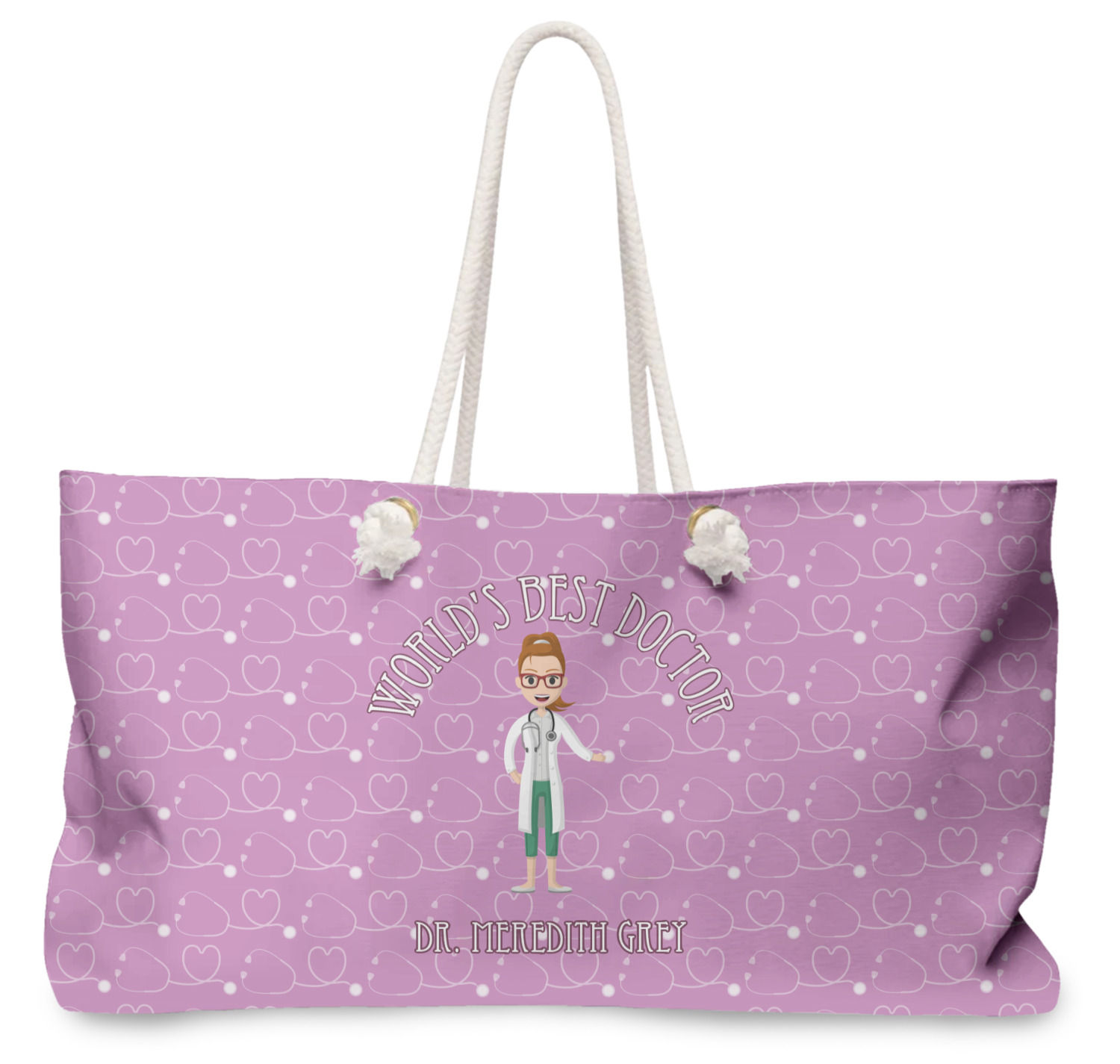 The design features an avatar doctor that is wearing a labcoat. You can easily change her hair color and skin tone. You can even swap her out for a male doctor! The background has a subtle pattern made out of stethescopes and is a fun purple. You personalization goes on top and below the avatar.