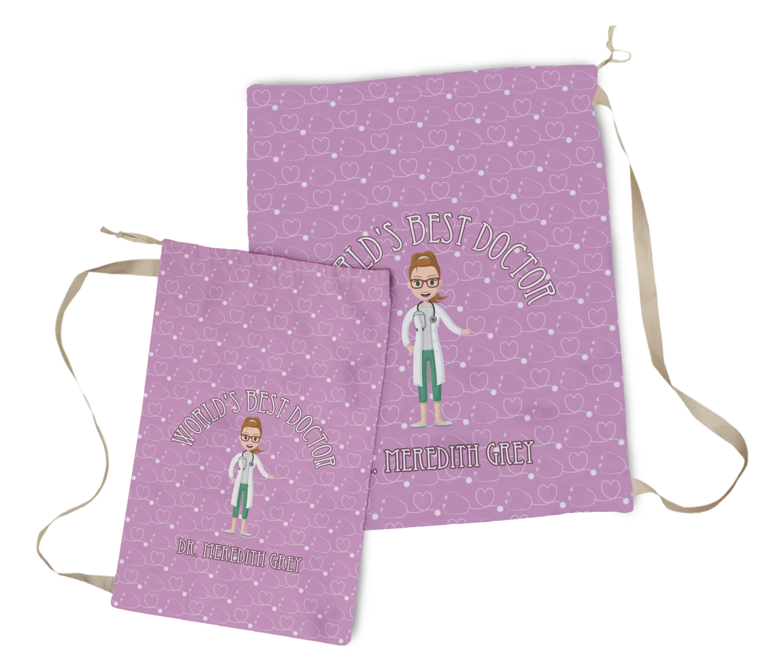 Carry your laundry in style with these customized laundry bags. Available in two sizes, featuring a natural colored woven strap and a cinch cord, these bags hold a lot of clothes or anything else you want to fit in them.