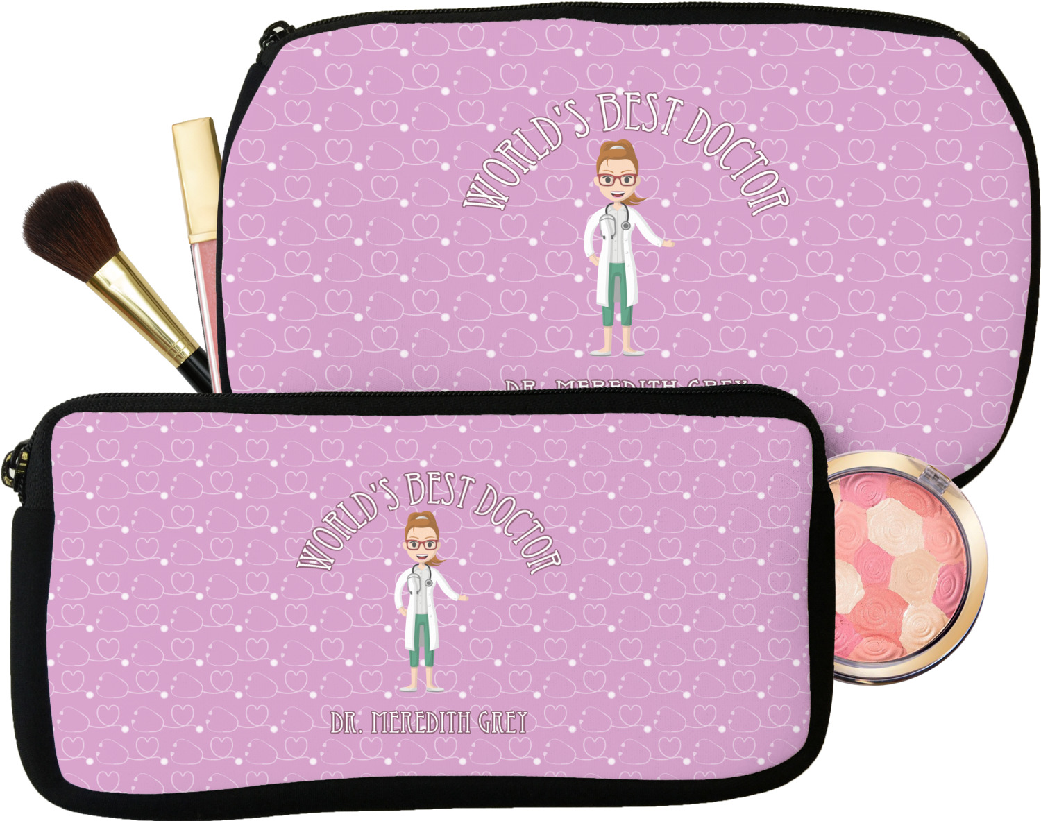 Our personalized makeup bags are available in many different designs, patterns and colors - so you are sure to find one that will love. They are made of neoprene (same material as wet-suits) and thus are water resistant, so spillages in your makeup bag will not end up all over you purse. They are customized on one side and are black on the other side and the zipper is black as well.