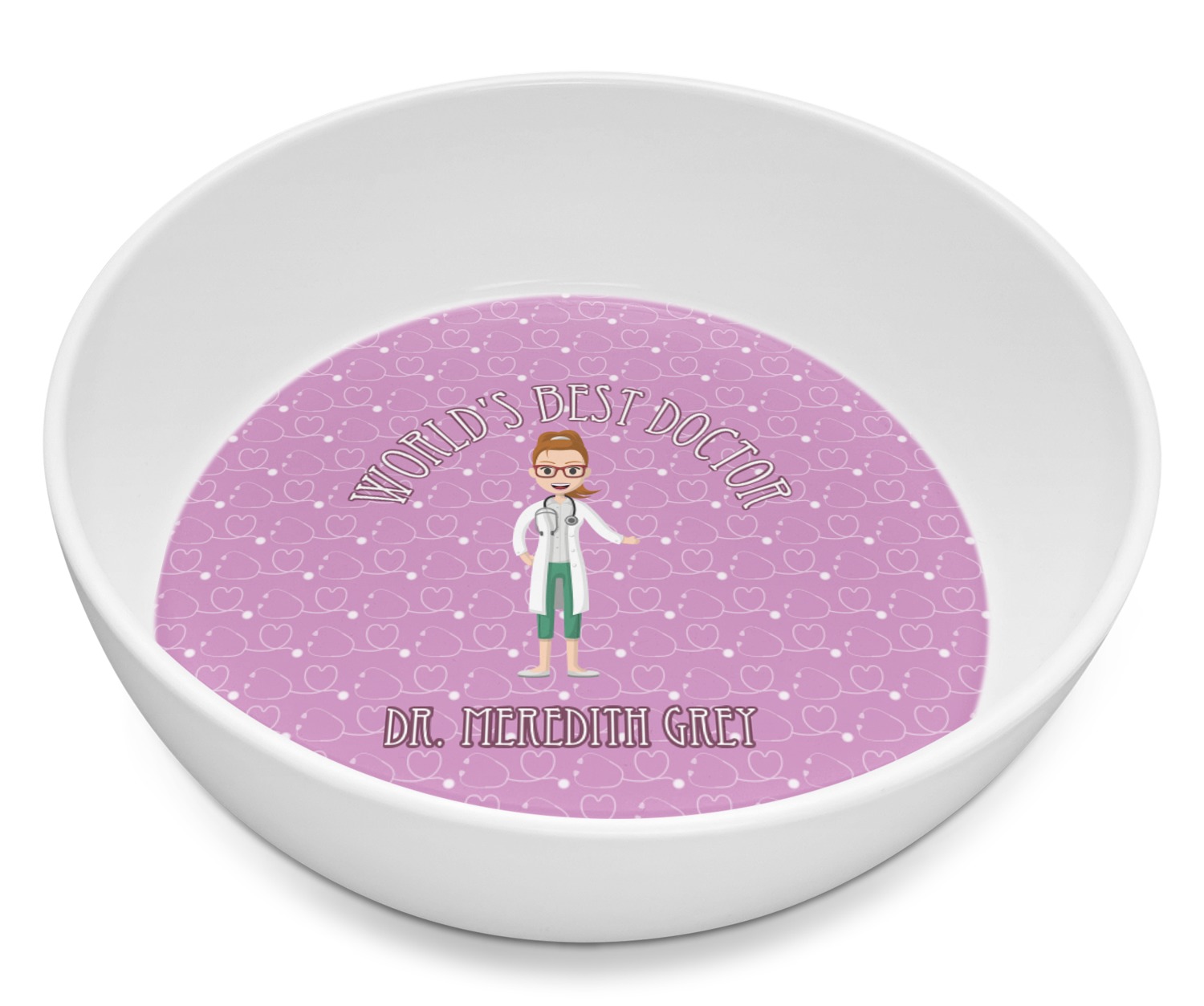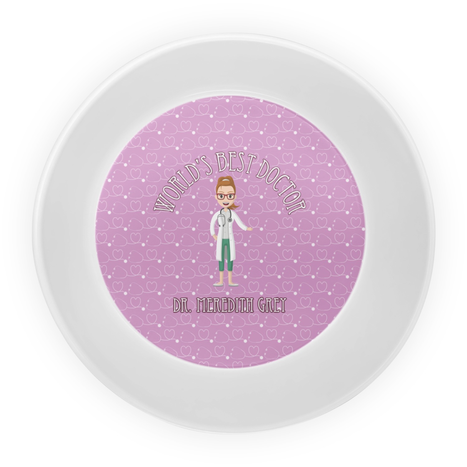 The design features an avatar doctor that is wearing a labcoat. You can easily change her hair color and skin tone. You can even swap her out for a male doctor! The background has a subtle pattern made out of stethescopes and is a fun purple. You personalization goes on top and below the avatar.
