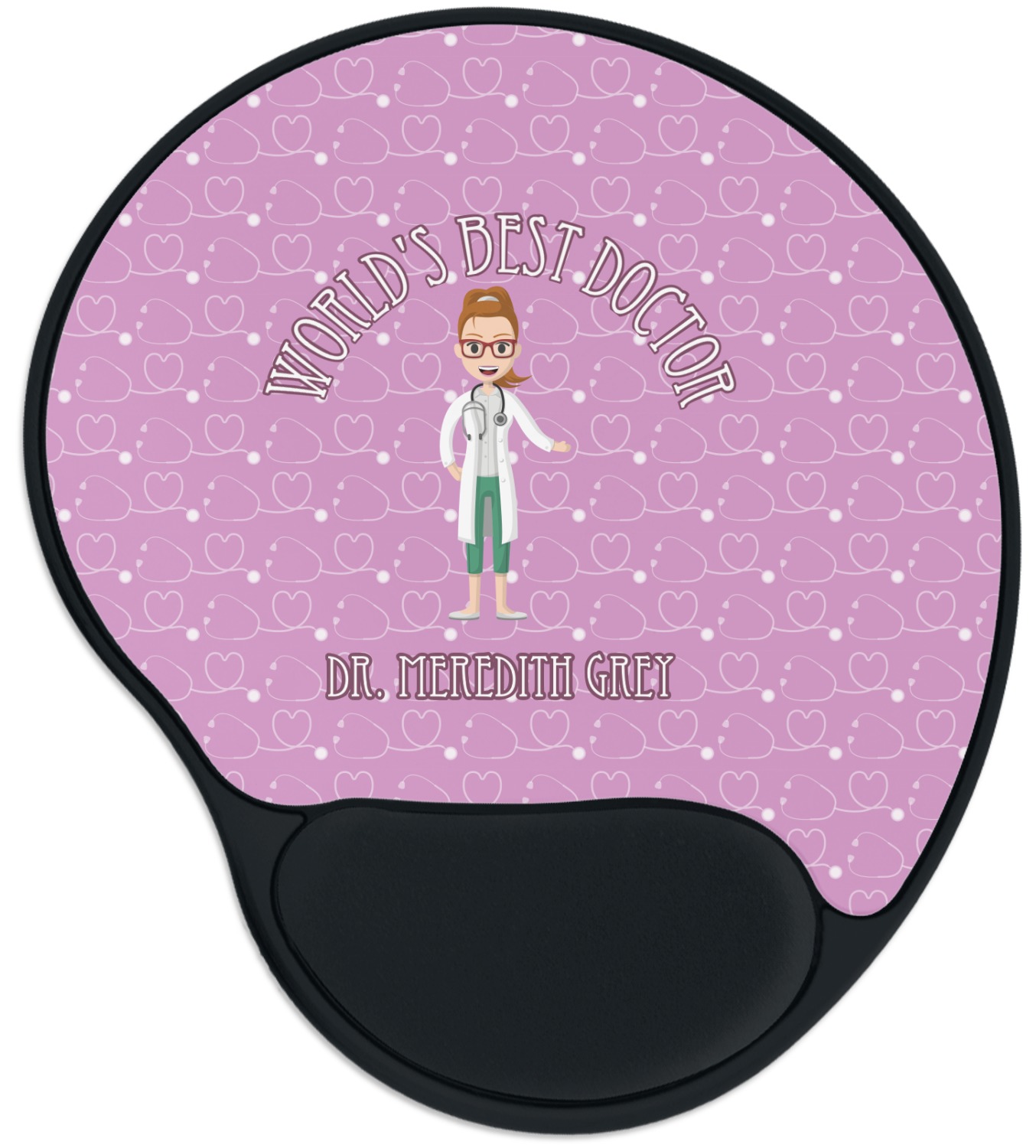 The design features an avatar doctor that is wearing a labcoat. You can easily change her hair color and skin tone. You can even swap her out for a male doctor! The background has a subtle pattern made out of stethescopes and is a fun purple. You personalization goes on top and below the avatar.
