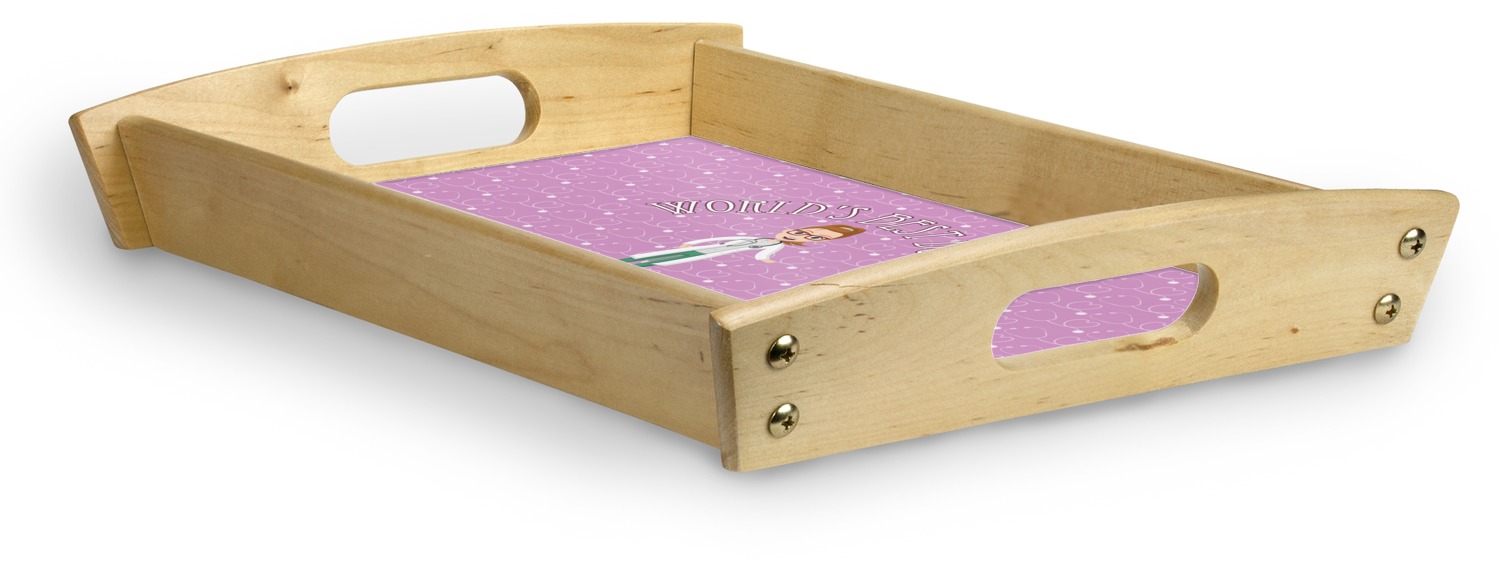 This serving tray with handles features square edges and two rounded sides, creating a very modern look. Each side is fabricated from a beautifully cut, natural wood. The bottom of the interior of the tray displays your customized design in bright, vibrant color. The tray is sold in both a black color and a natural wood look. Each variation of the wood serving tray has two sizes: Small, which is 14" x 10" x 2.25", and Large, which is 19.5" x 13.5" x 2.75".