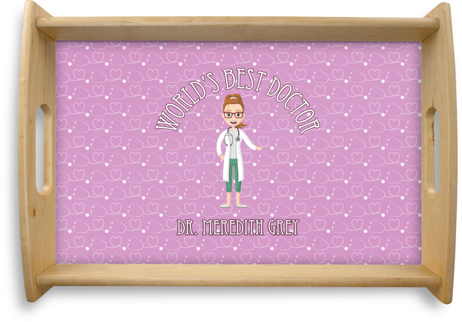 The design features an avatar doctor that is wearing a labcoat. You can easily change her hair color and skin tone. You can even swap her out for a male doctor! The background has a subtle pattern made out of stethescopes and is a fun purple. You personalization goes on top and below the avatar.
