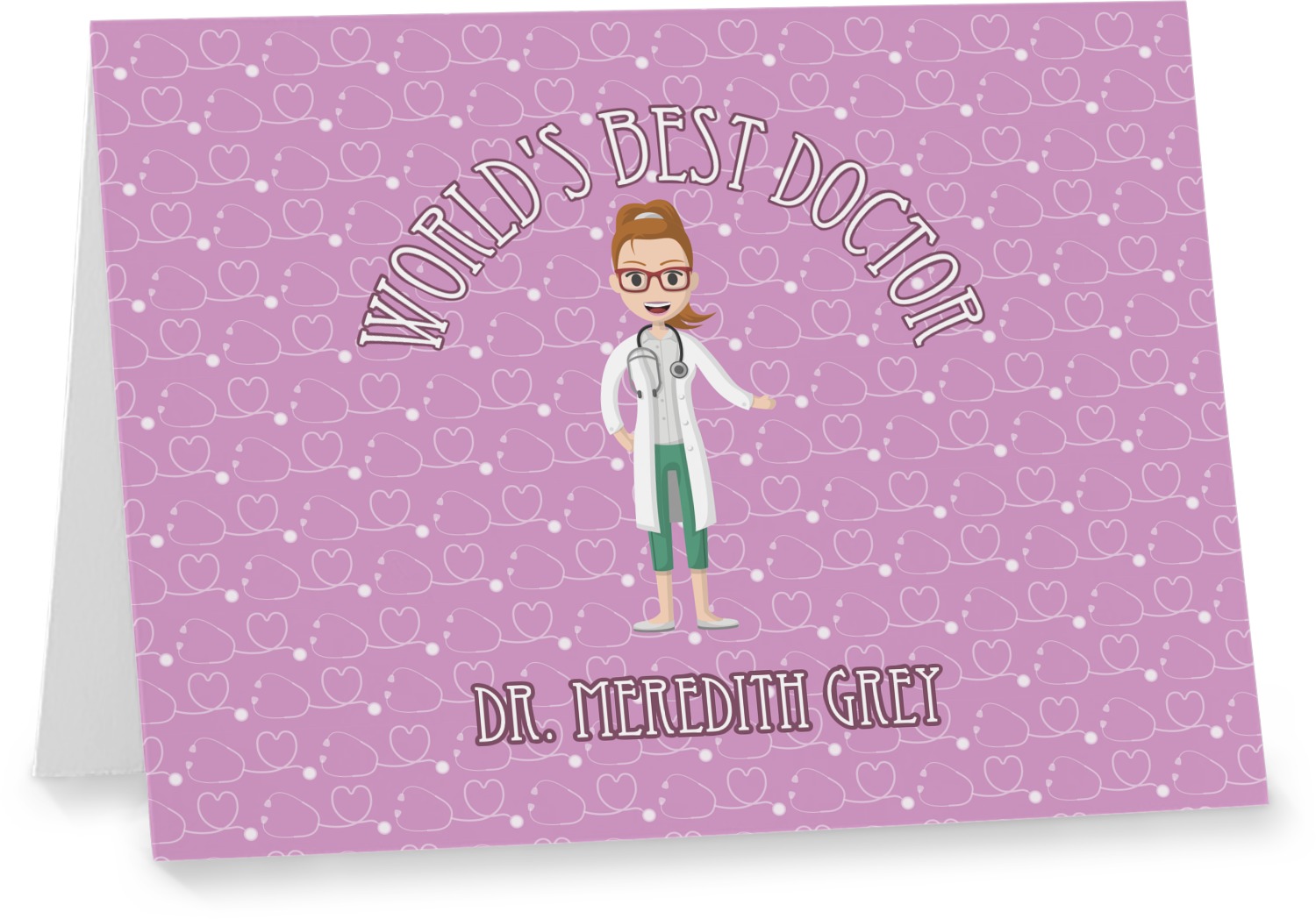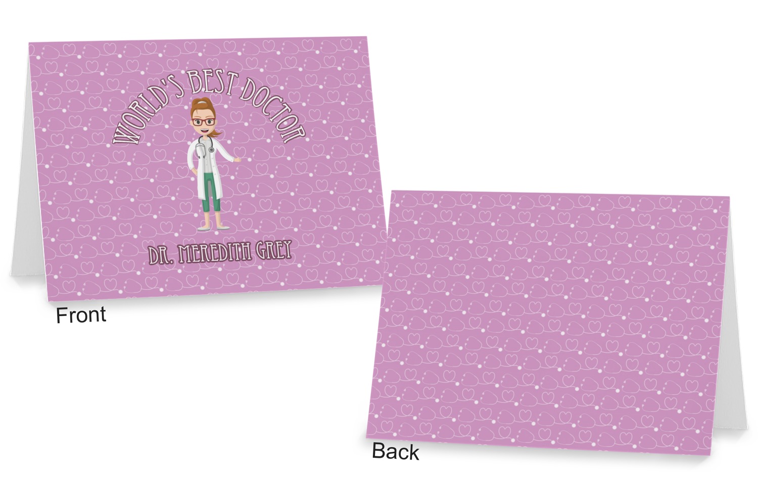 The design features an avatar doctor that is wearing a labcoat. You can easily change her hair color and skin tone. You can even swap her out for a male doctor! The background has a subtle pattern made out of stethescopes and is a fun purple. You personalization goes on top and below the avatar.