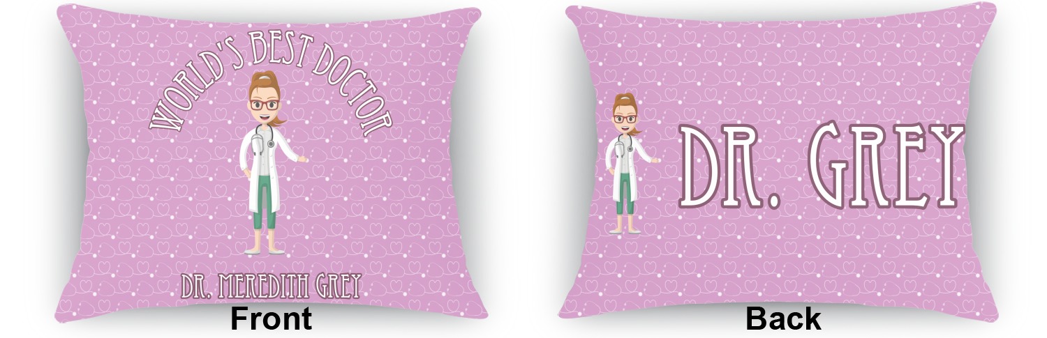 The design features an avatar doctor that is wearing a labcoat. You can easily change her hair color and skin tone. You can even swap her out for a male doctor! The background has a subtle pattern made out of stethescopes and is a fun purple. You personalization goes on top and below the avatar.