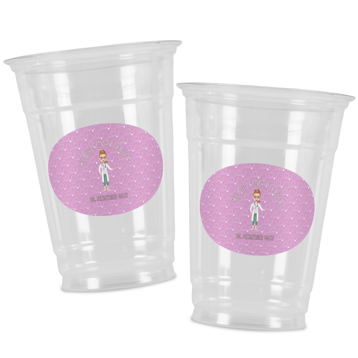 The design features an avatar doctor that is wearing a labcoat. You can easily change her hair color and skin tone. You can even swap her out for a male doctor! The background has a subtle pattern made out of stethescopes and is a fun purple. You personalization goes on top and below the avatar.