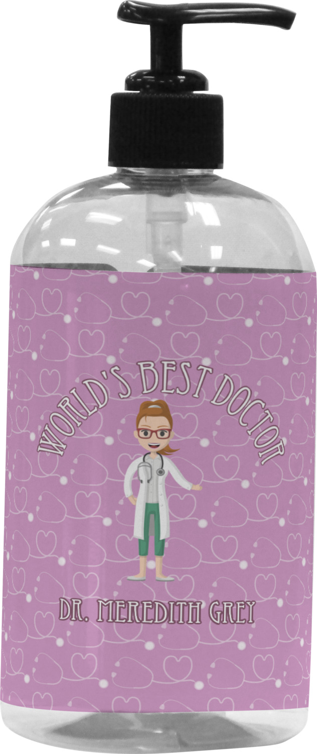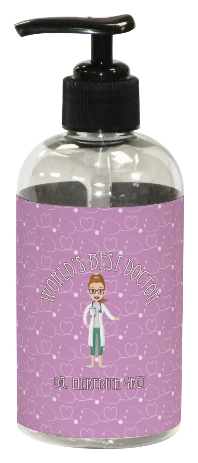 The design features an avatar doctor that is wearing a labcoat. You can easily change her hair color and skin tone. You can even swap her out for a male doctor! The background has a subtle pattern made out of stethescopes and is a fun purple. You personalization goes on top and below the avatar.
