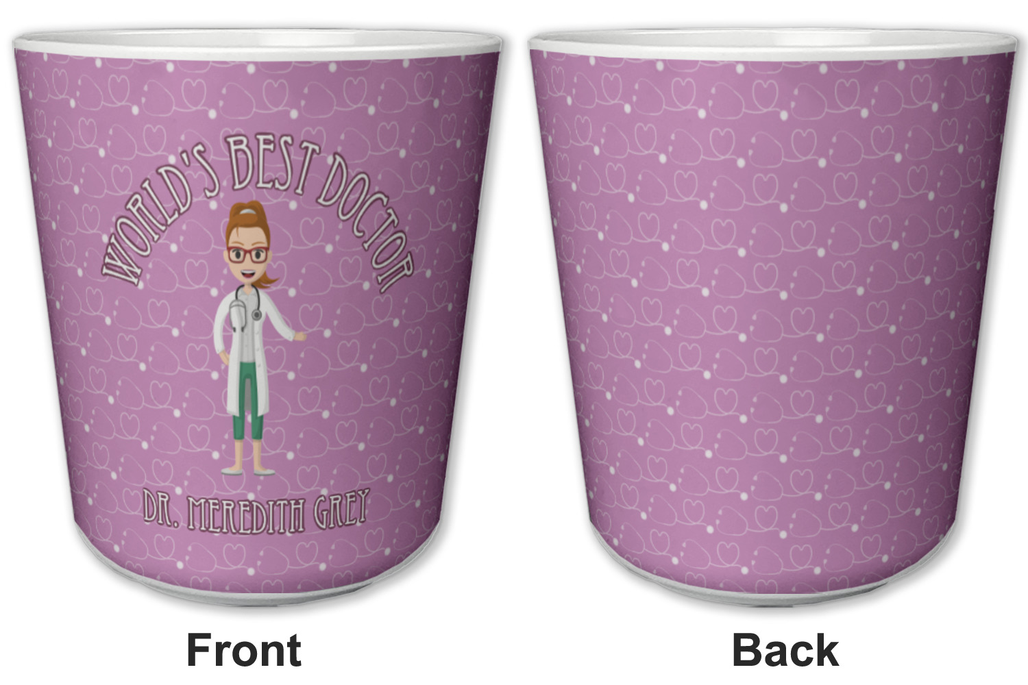 The design features an avatar doctor that is wearing a labcoat. You can easily change her hair color and skin tone. You can even swap her out for a male doctor! The background has a subtle pattern made out of stethescopes and is a fun purple. You personalization goes on top and below the avatar.