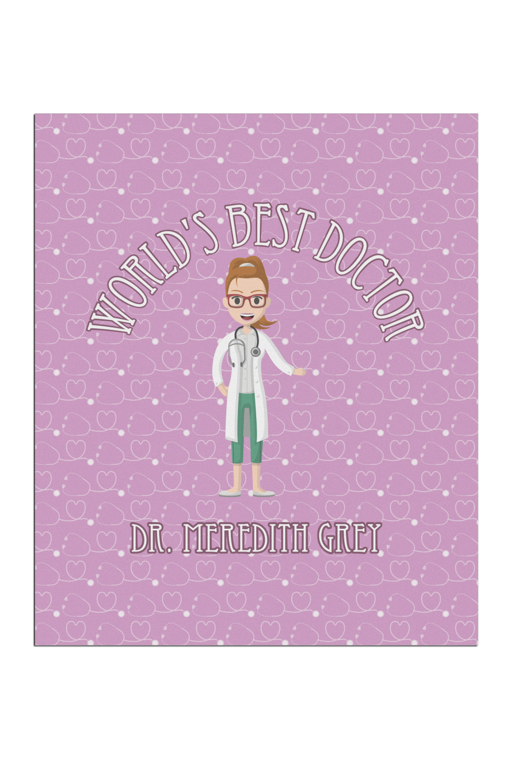 The design features an avatar doctor that is wearing a labcoat. You can easily change her hair color and skin tone. You can even swap her out for a male doctor! The background has a subtle pattern made out of stethescopes and is a fun purple. You personalization goes on top and below the avatar.