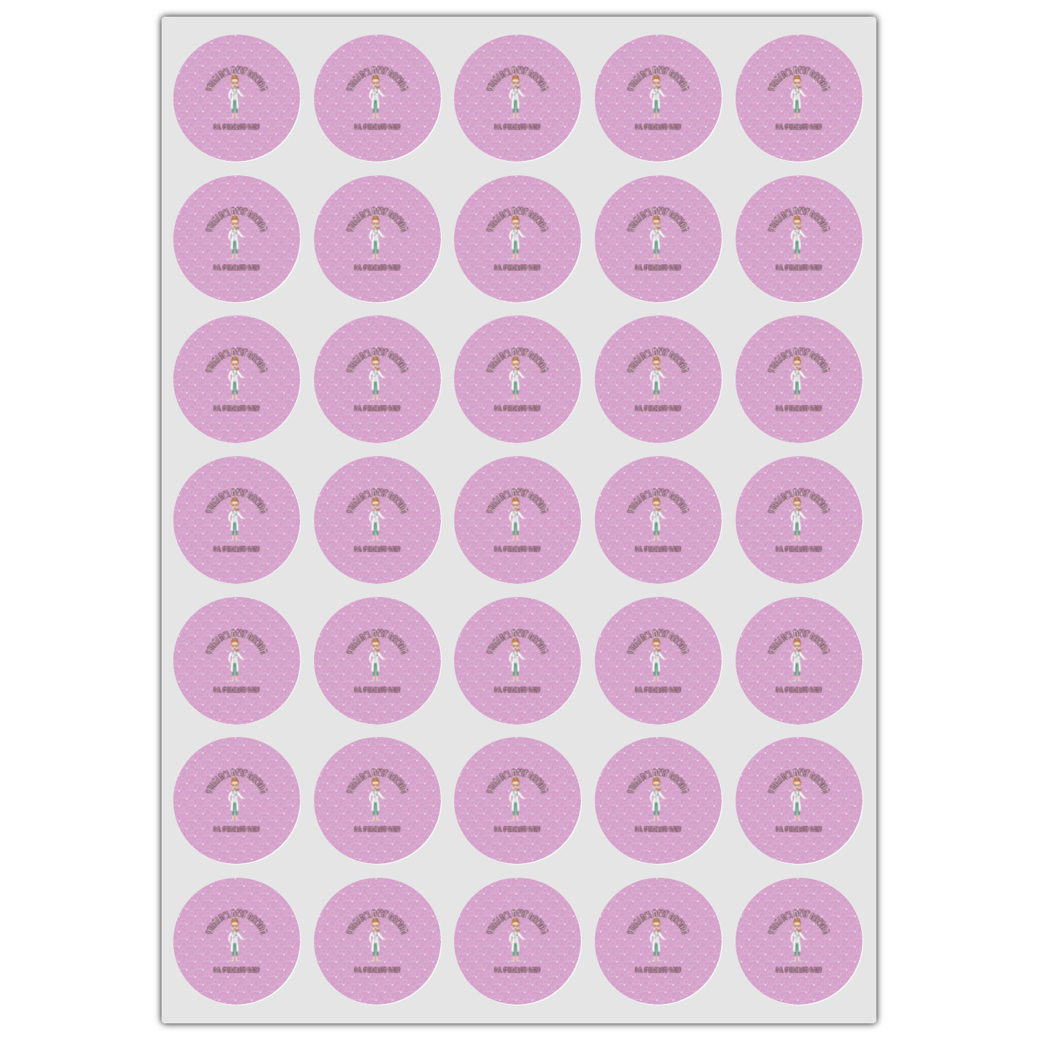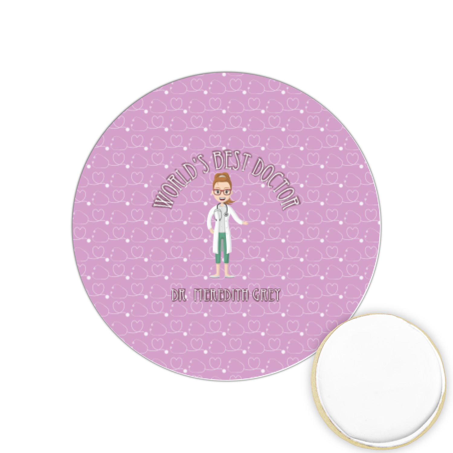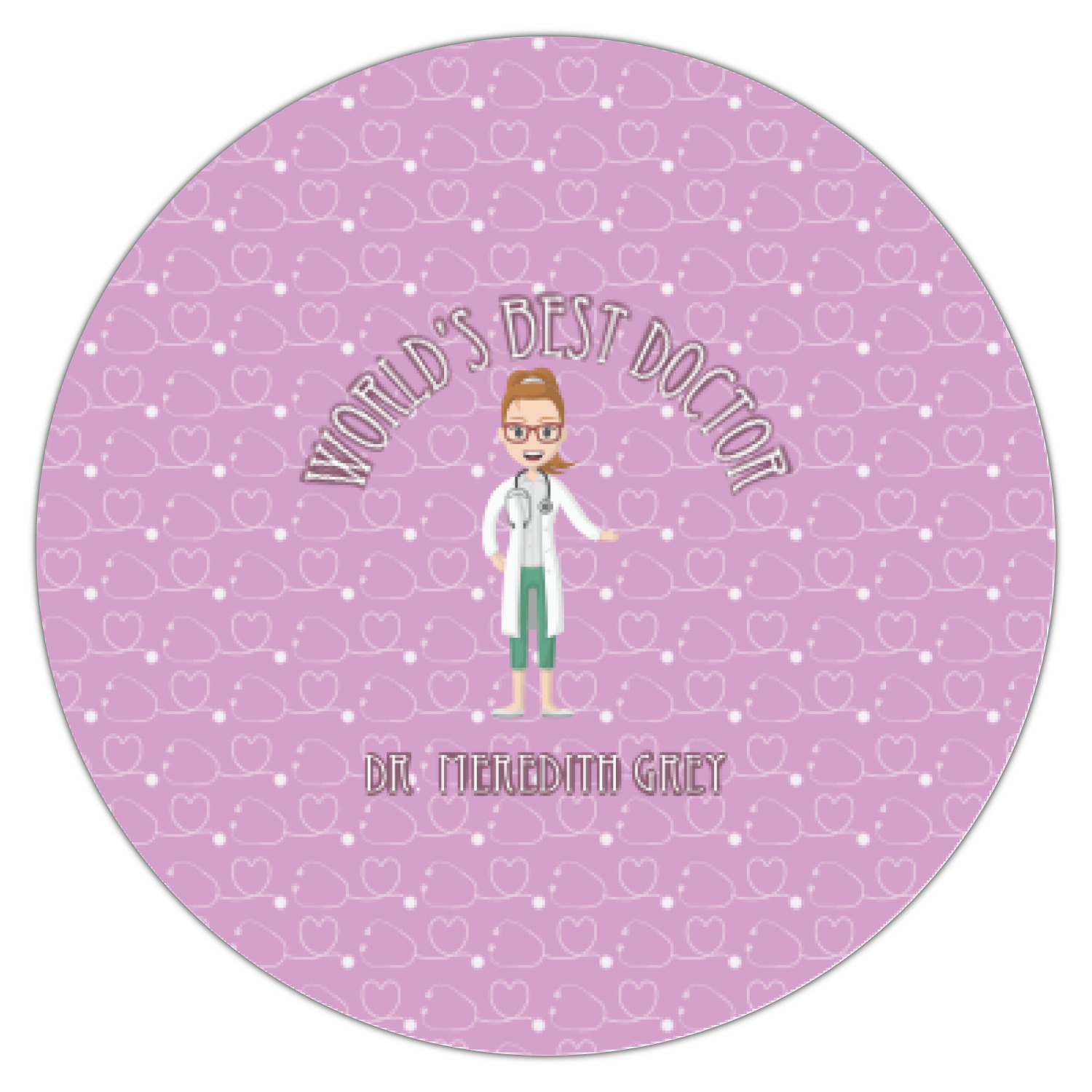 The design features an avatar doctor that is wearing a labcoat. You can easily change her hair color and skin tone. You can even swap her out for a male doctor! The background has a subtle pattern made out of stethescopes and is a fun purple. You personalization goes on top and below the avatar.