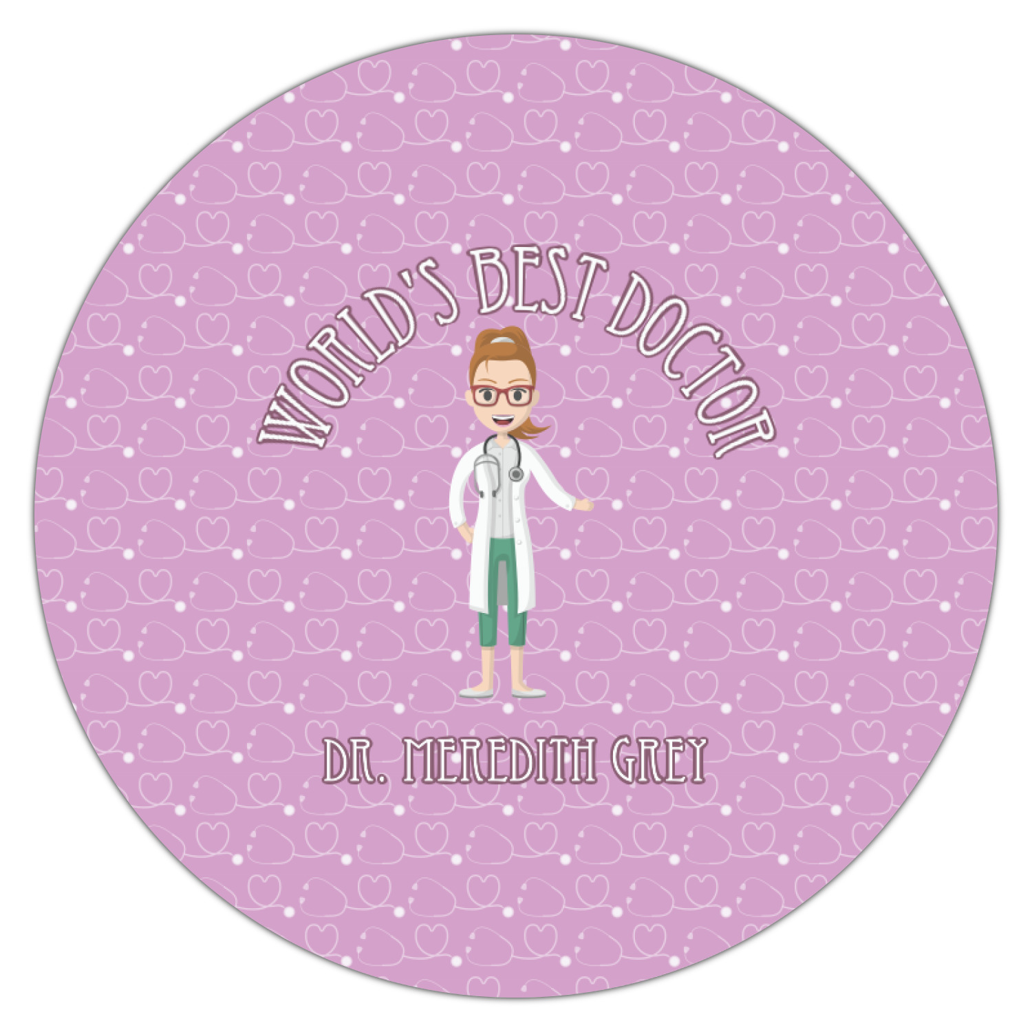 The design features an avatar doctor that is wearing a labcoat. You can easily change her hair color and skin tone. You can even swap her out for a male doctor! The background has a subtle pattern made out of stethescopes and is a fun purple. You personalization goes on top and below the avatar.