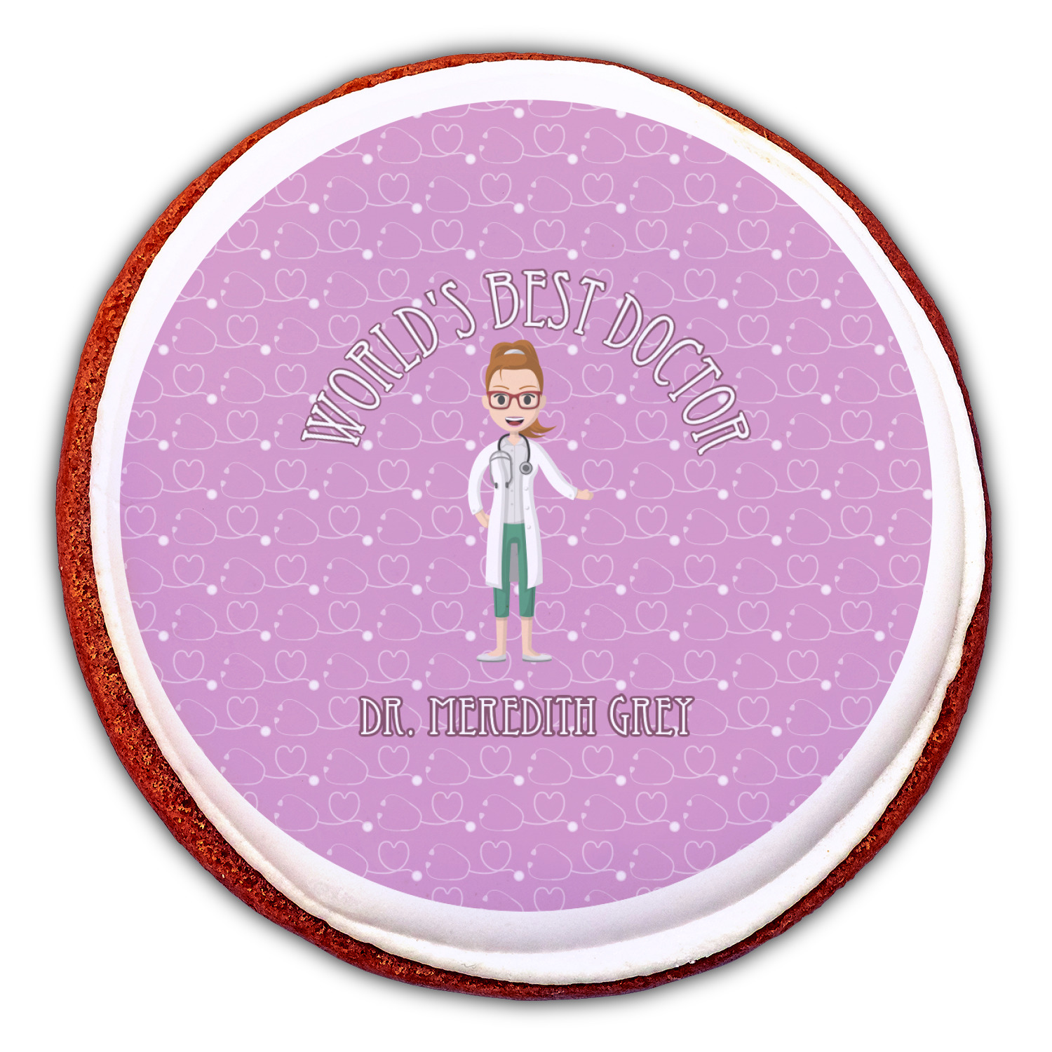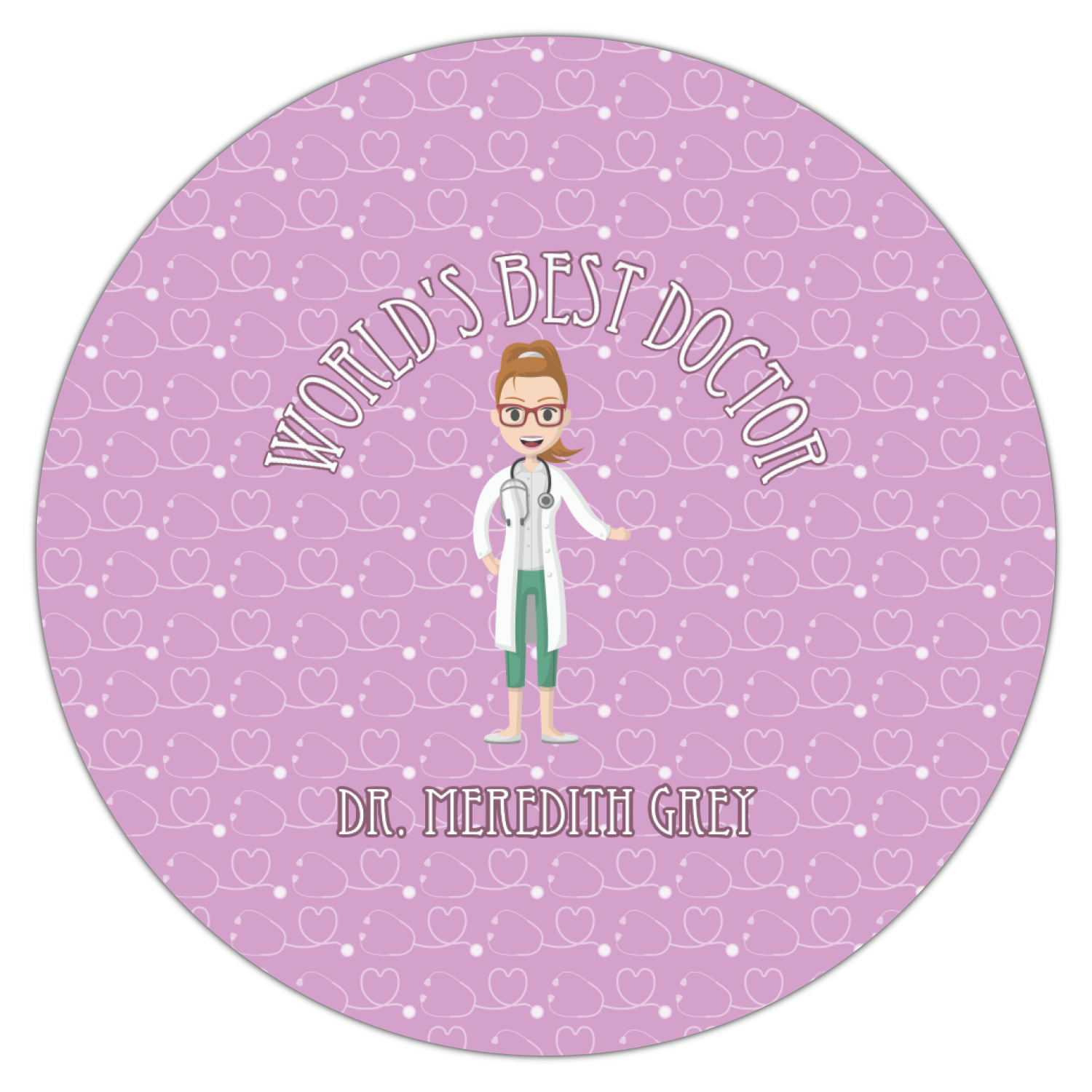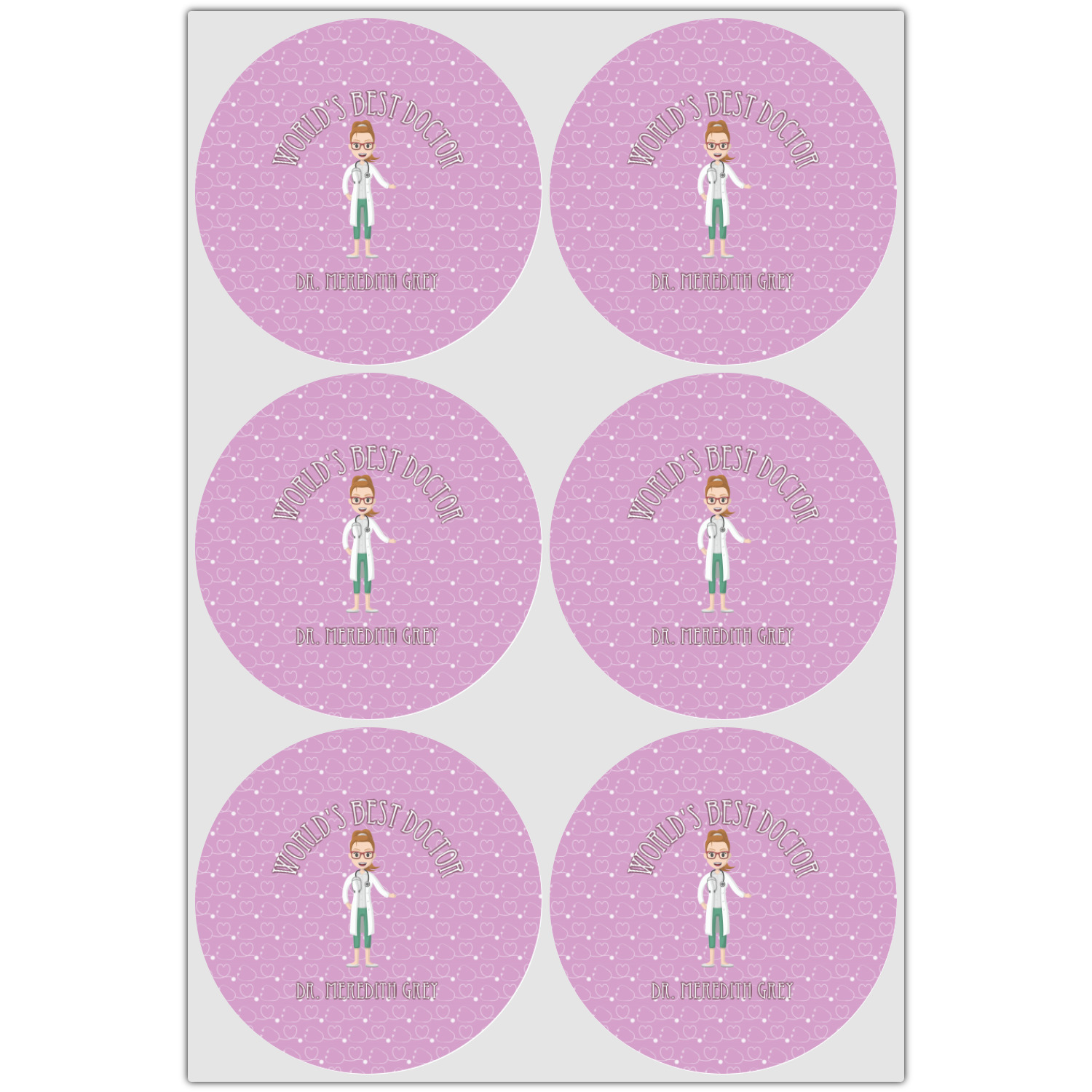 The design features an avatar doctor that is wearing a labcoat. You can easily change her hair color and skin tone. You can even swap her out for a male doctor! The background has a subtle pattern made out of stethescopes and is a fun purple. You personalization goes on top and below the avatar.