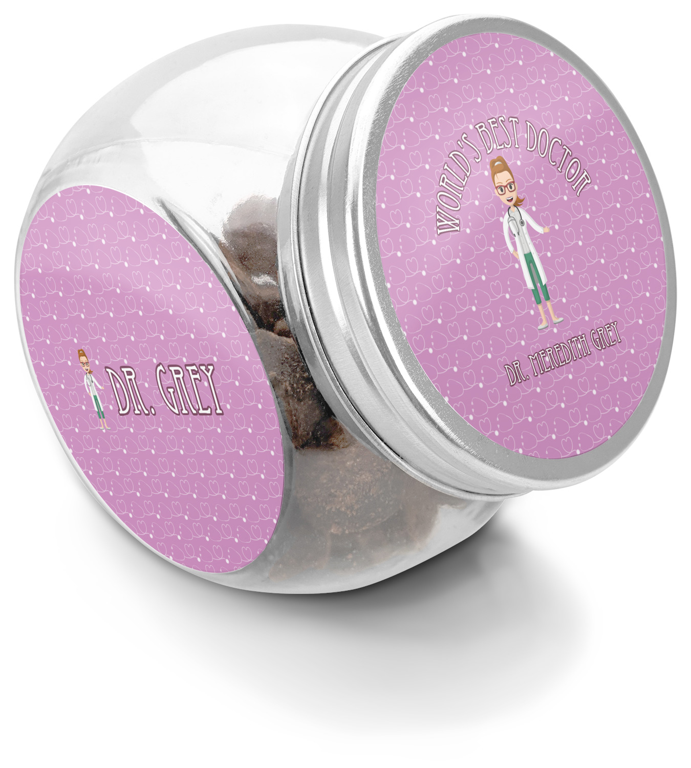 This treat jar is an excellent way to store treats for your favorite canine or feline. Moreover, their delicate, classy appearance makes them a tasteful addition to your countertop's décor. Crafted from clear glass, its unique construction and silver metal, screw-on lid allows for quick and easy access. Three, permanent, vinyl stickers are applied to both sides of the jar and lid, presenting your personalized design. The base of this glass, dog treat jar is 3.4" x 4.75", and the jar stands at 5" tall. Though on the smaller side, this jar is best suited for smaller treats or training treats.