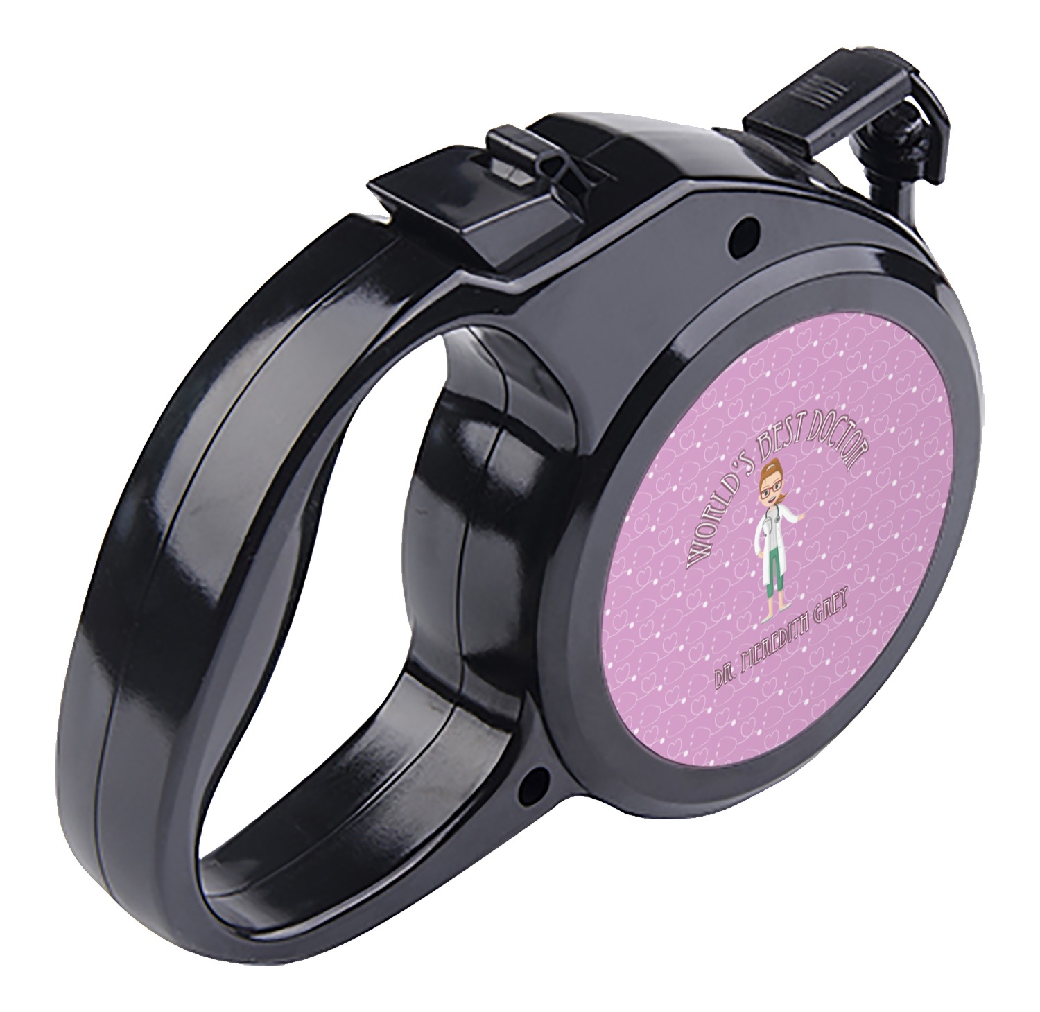 The leash's plastic handle is accommodating of your grip and displays your customization on both sides. The dog leash also features the traditional bolt snap clip, for easy fastening to your dog's collar. The leash and leash handle themselves are both black in color.