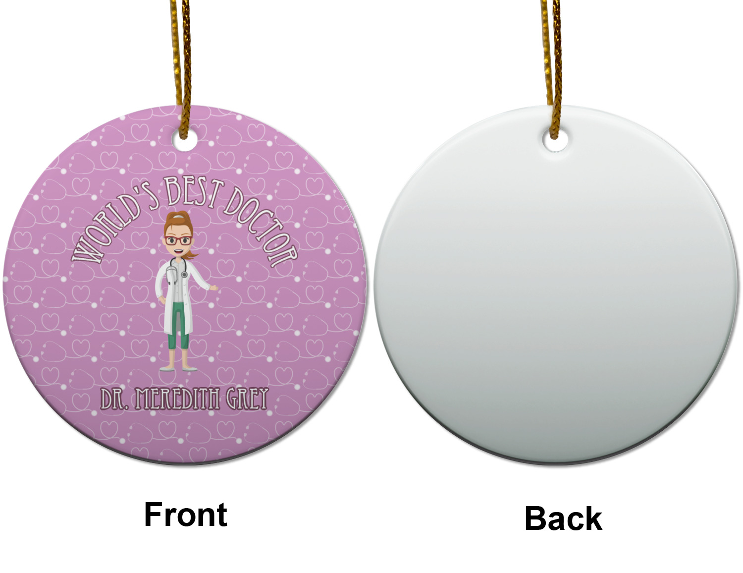 The design features an avatar doctor that is wearing a labcoat. You can easily change her hair color and skin tone. You can even swap her out for a male doctor! The background has a subtle pattern made out of stethescopes and is a fun purple. You personalization goes on top and below the avatar.