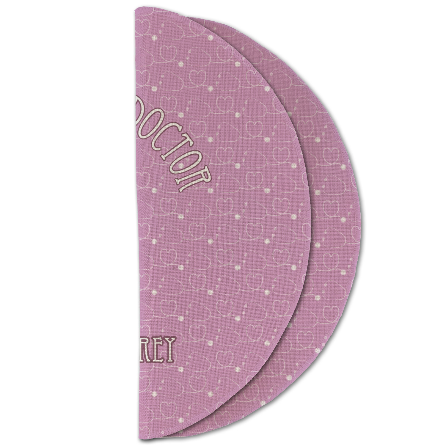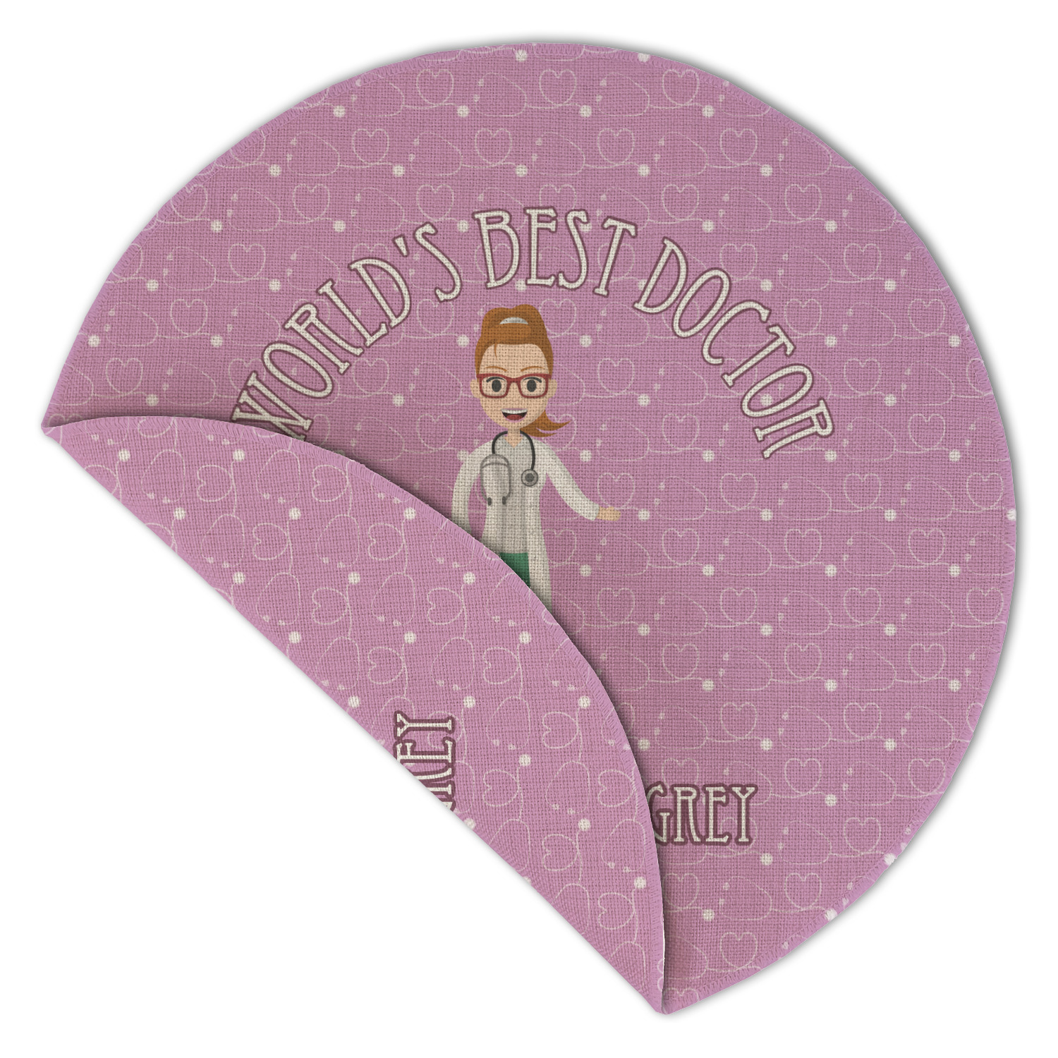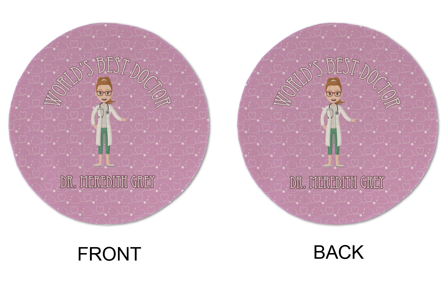The design features an avatar doctor that is wearing a labcoat. You can easily change her hair color and skin tone. You can even swap her out for a male doctor! The background has a subtle pattern made out of stethescopes and is a fun purple. You personalization goes on top and below the avatar.