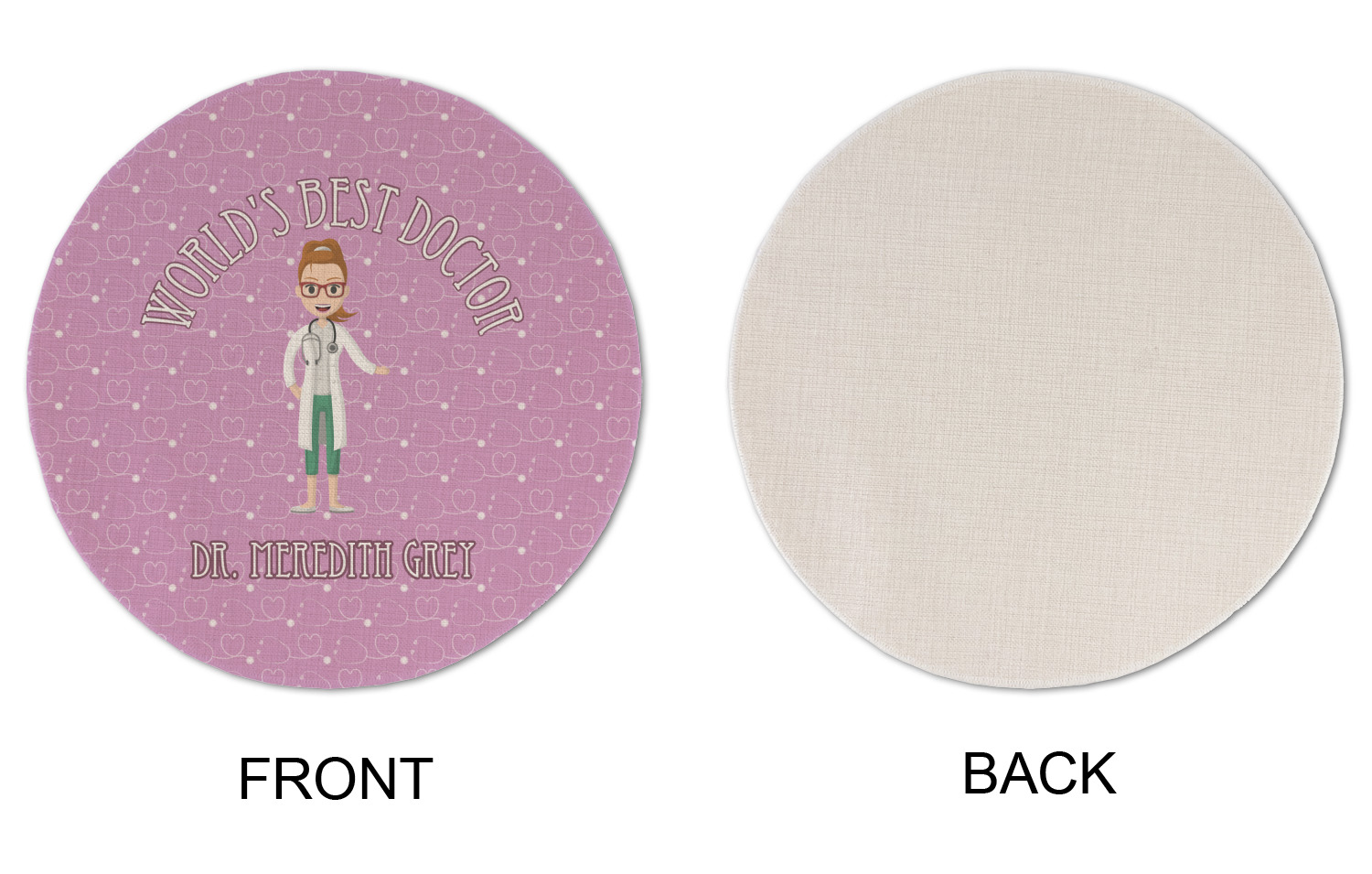 The design features an avatar doctor that is wearing a labcoat. You can easily change her hair color and skin tone. You can even swap her out for a male doctor! The background has a subtle pattern made out of stethescopes and is a fun purple. You personalization goes on top and below the avatar.