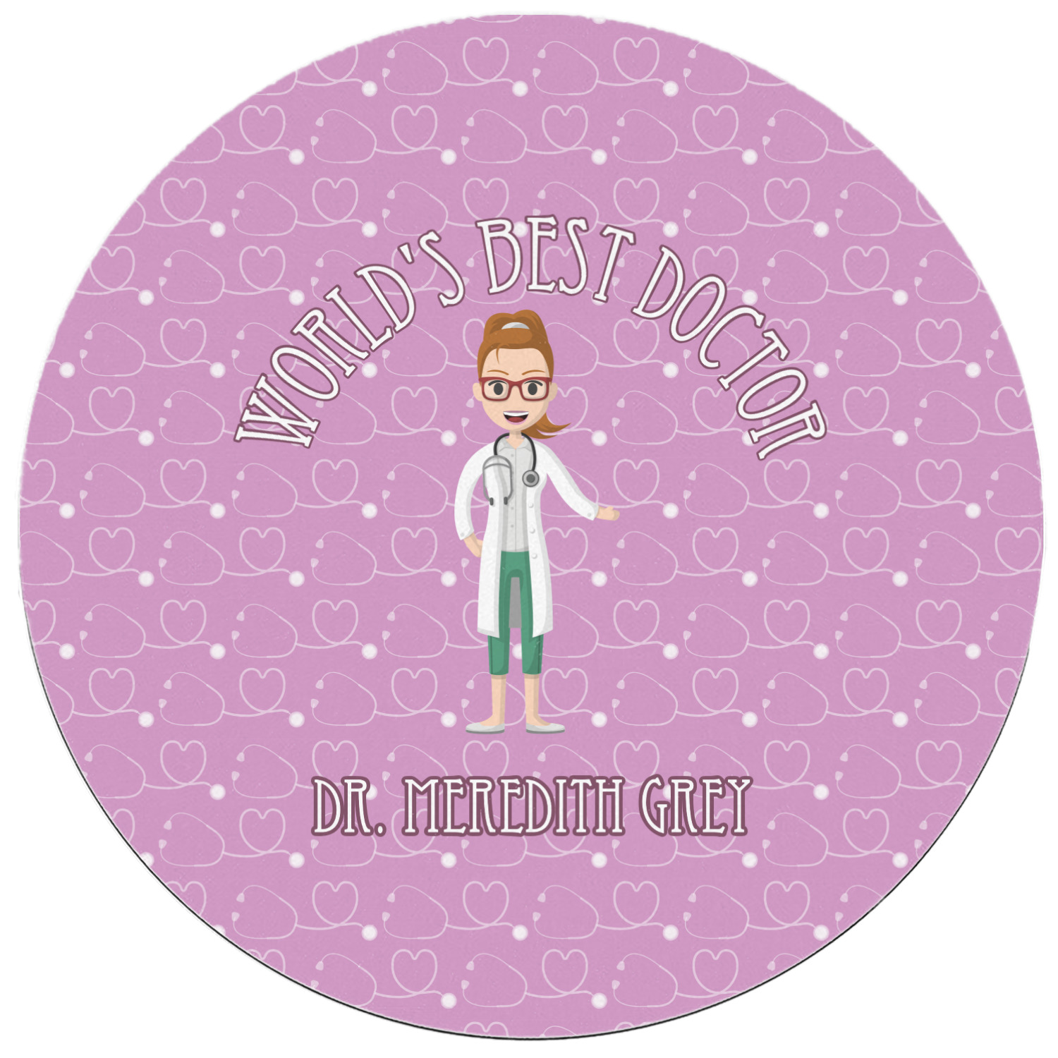 The design features an avatar doctor that is wearing a labcoat. You can easily change her hair color and skin tone. You can even swap her out for a male doctor! The background has a subtle pattern made out of stethescopes and is a fun purple. You personalization goes on top and below the avatar.