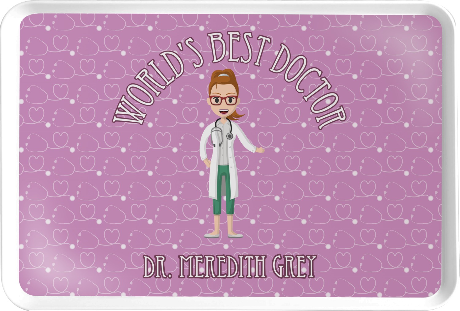 The design features an avatar doctor that is wearing a labcoat. You can easily change her hair color and skin tone. You can even swap her out for a male doctor! The background has a subtle pattern made out of stethescopes and is a fun purple. You personalization goes on top and below the avatar.