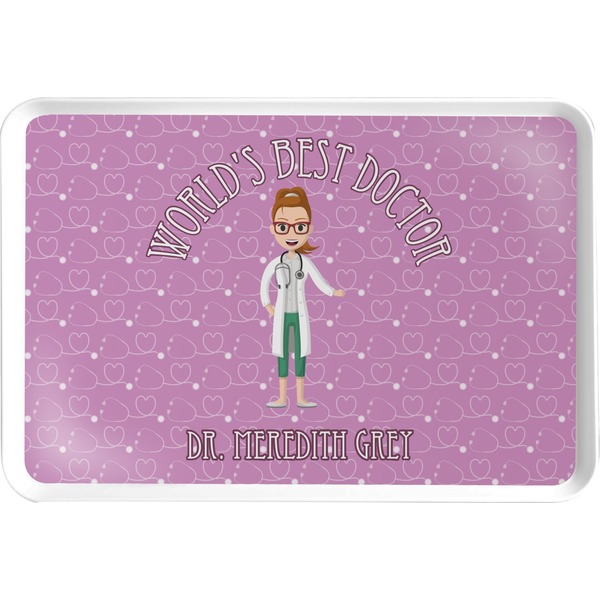 Made from a heavy melamine, these decorative trays are break resistant and are BPA free. At 14" x 9.25", these serving dishes are spacious enough to accommodate several drinks, bowls, or more. The tray features ridges underneath that allow for a sturdy stance upon any table or counter-top. We display your customization at the bottom of the tray's interior, while the remaining sides of the tray are a chic white.
