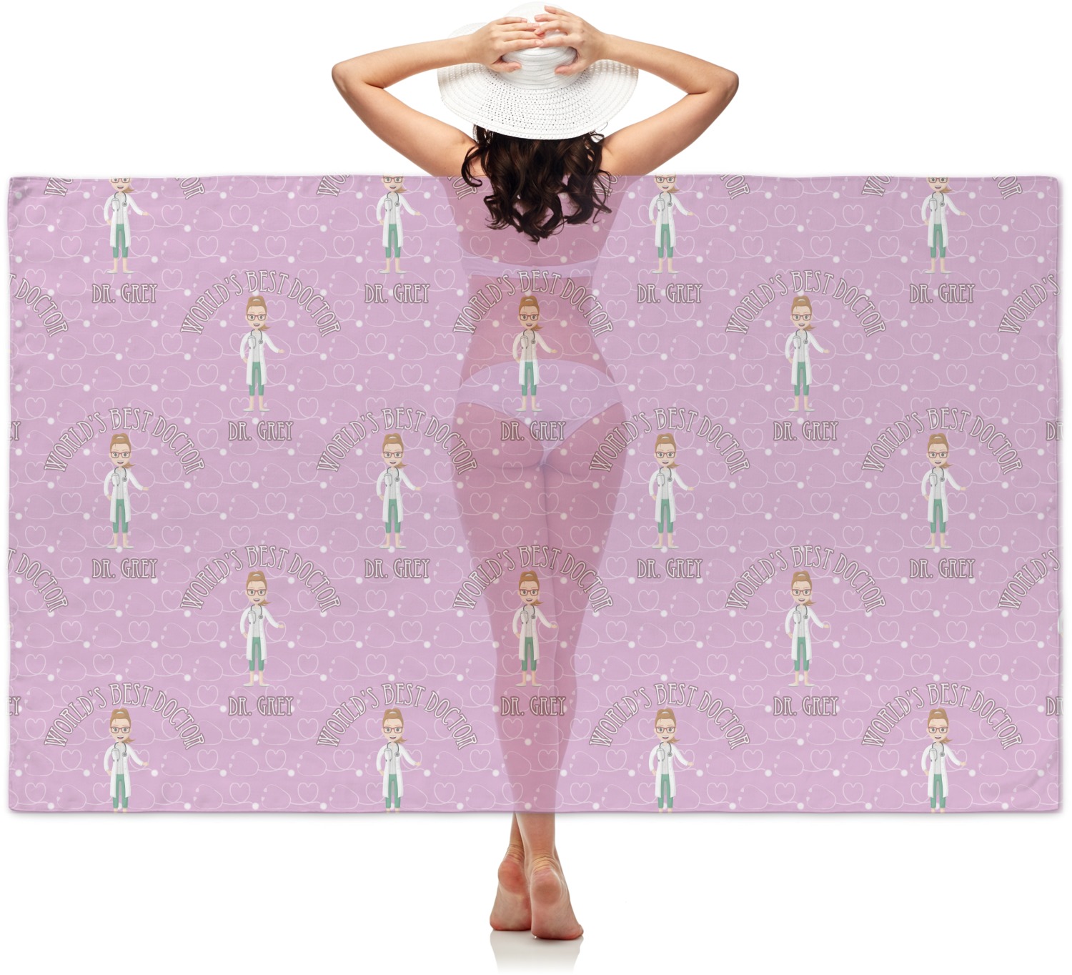 The design features an avatar doctor that is wearing a labcoat. You can easily change her hair color and skin tone. You can even swap her out for a male doctor! The background has a subtle pattern made out of stethescopes and is a fun purple. You personalization goes on top and below the avatar.