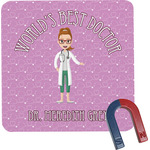 The design features an avatar doctor that is wearing a labcoat. You can easily change her hair color and skin tone. You can even swap her out for a male doctor! The background has a subtle pattern made out of stethescopes and is a fun purple. You personalization goes on top and below the avatar.