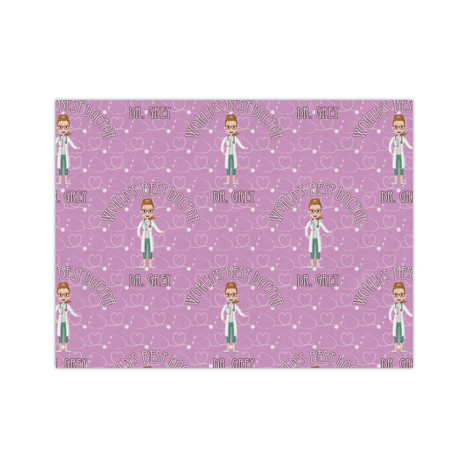 The design features an avatar doctor that is wearing a labcoat. You can easily change her hair color and skin tone. You can even swap her out for a male doctor! The background has a subtle pattern made out of stethescopes and is a fun purple. You personalization goes on top and below the avatar.
