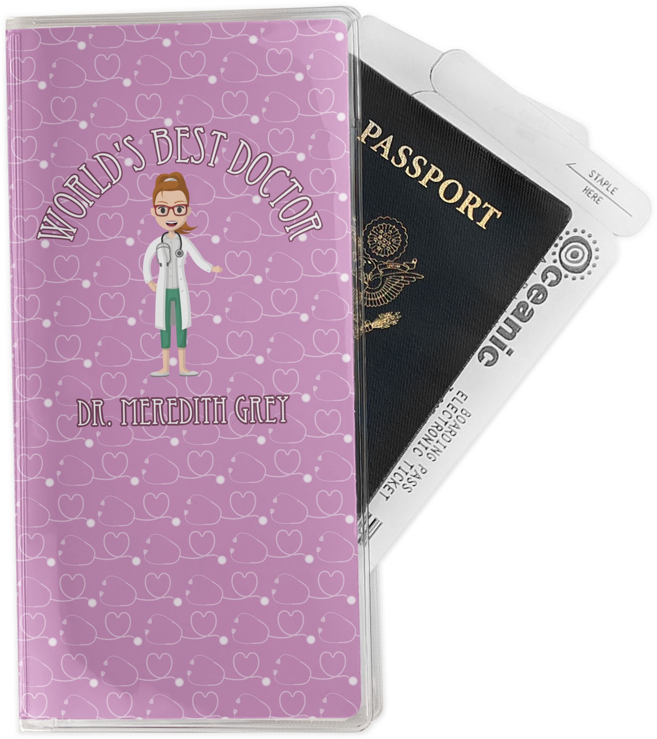 The design features an avatar doctor that is wearing a labcoat. You can easily change her hair color and skin tone. You can even swap her out for a male doctor! The background has a subtle pattern made out of stethescopes and is a fun purple. You personalization goes on top and below the avatar.