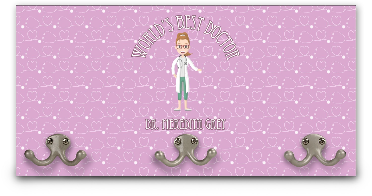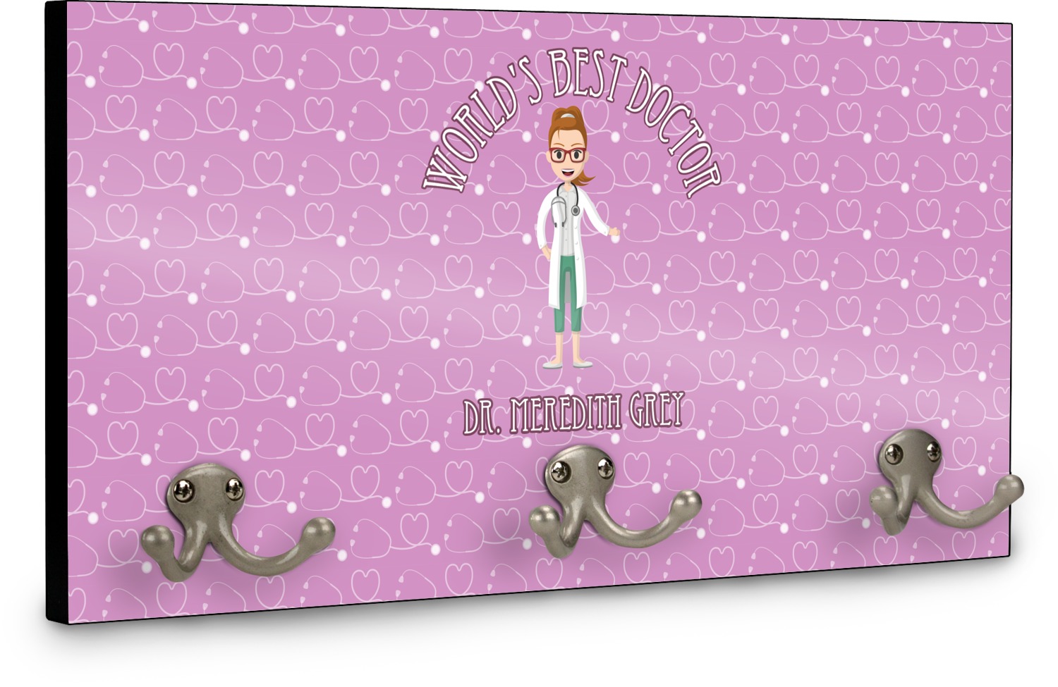 The design features an avatar doctor that is wearing a labcoat. You can easily change her hair color and skin tone. You can even swap her out for a male doctor! The background has a subtle pattern made out of stethescopes and is a fun purple. You personalization goes on top and below the avatar.