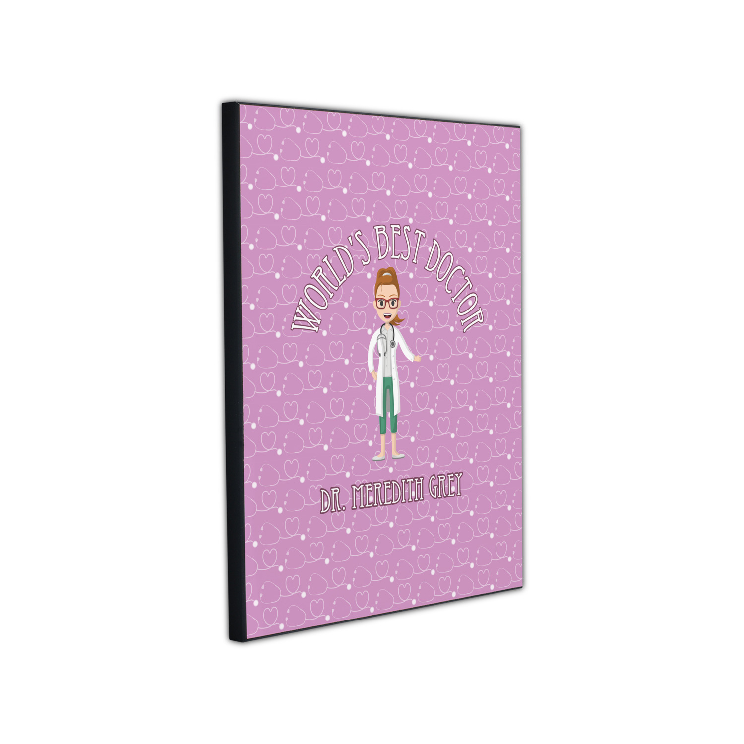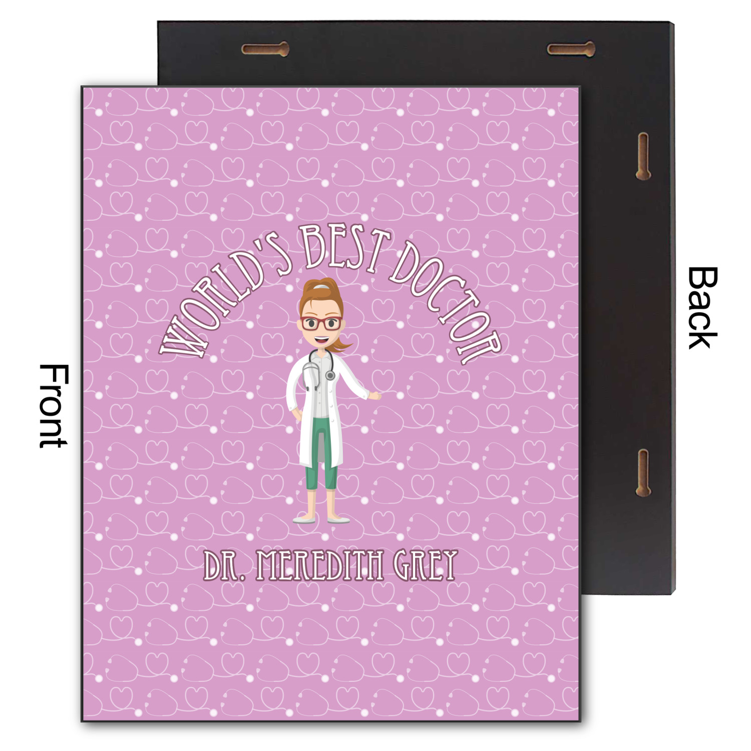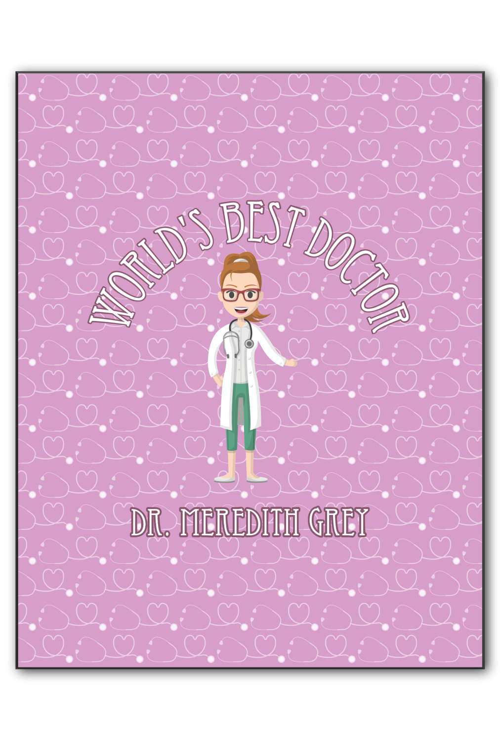 The design features an avatar doctor that is wearing a labcoat. You can easily change her hair color and skin tone. You can even swap her out for a male doctor! The background has a subtle pattern made out of stethescopes and is a fun purple. You personalization goes on top and below the avatar.