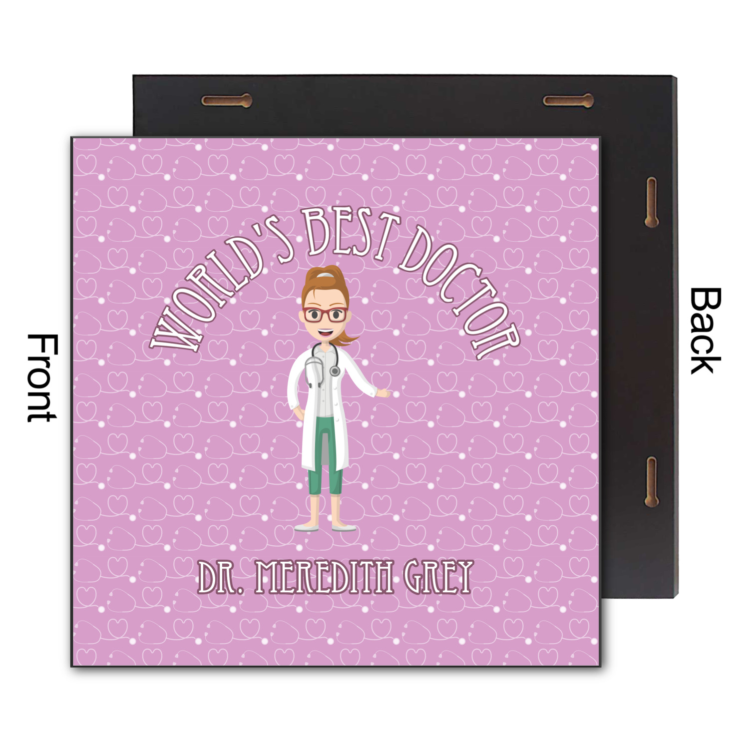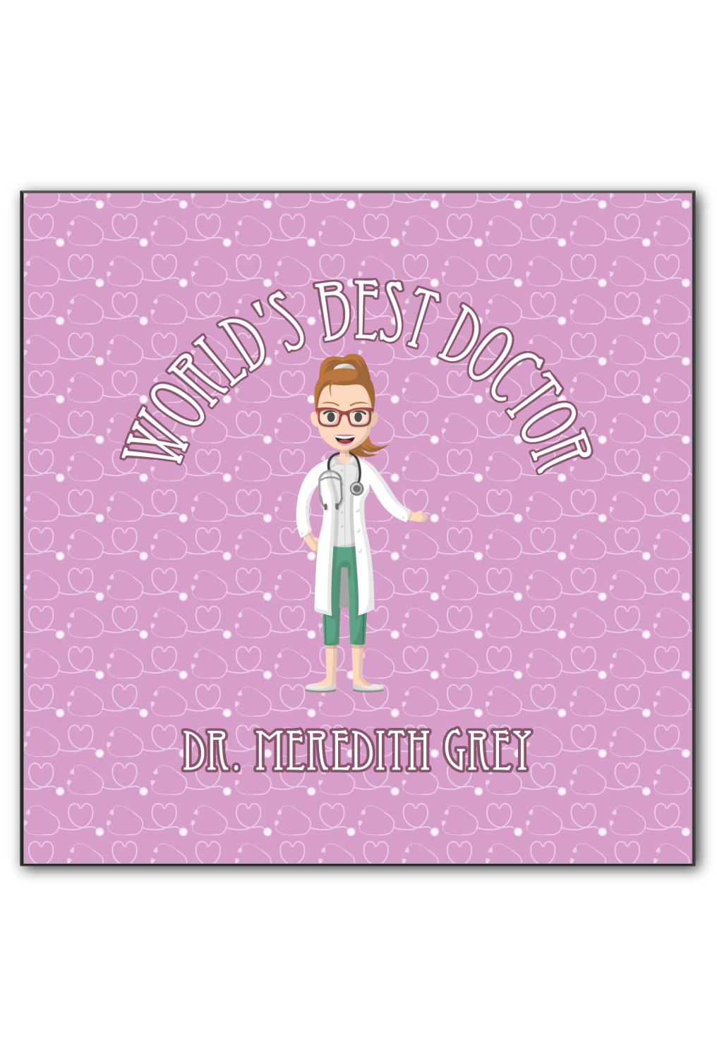 The design features an avatar doctor that is wearing a labcoat. You can easily change her hair color and skin tone. You can even swap her out for a male doctor! The background has a subtle pattern made out of stethescopes and is a fun purple. You personalization goes on top and below the avatar.